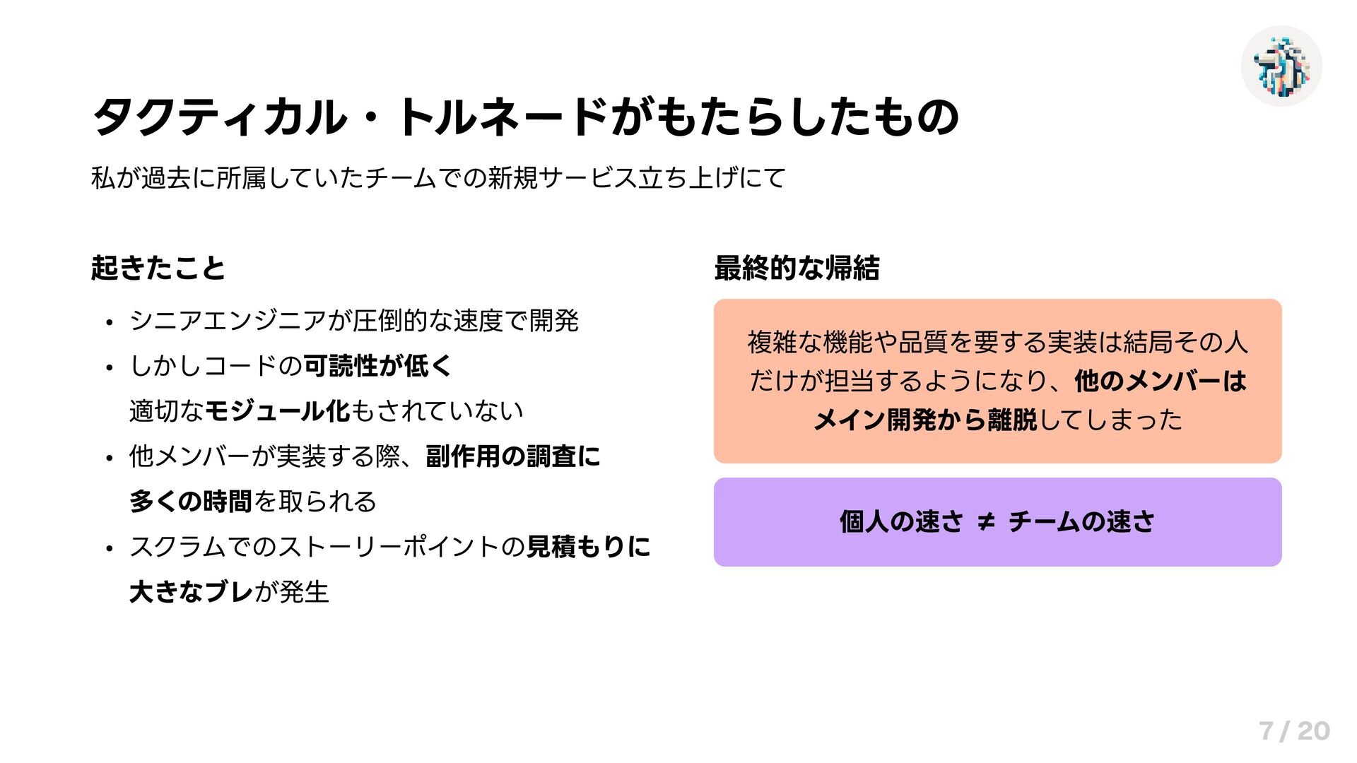 タクティカル・トルネードがもたらしたもの 私が過去に所属していたチームでの新規サービス立ち上げにて 起きたこと シニアエンジニアが圧倒的な速度で開発 しかしコードの可読性が低く 適切なモジュール化もされていない 他メンバーが実装する際、副作用の調査に 多くの時間を取られる スクラムでのストーリーポイントの見積もりに 大きなブレが発生