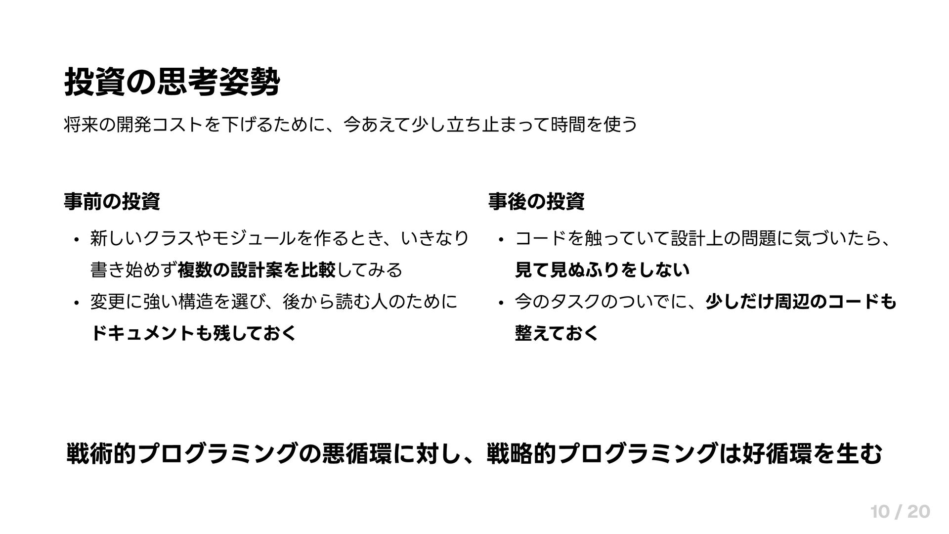 投資の思考姿勢 将来の開発コストを下げるために、今あえて少し立ち止まって時間を使う 事前の投資 新しいクラスやモジュールを作るとき、いきなり 書き始めず複数の設計案を比較してみる 変更に強い構造を選び、後から読む人のために ドキュメントも残しておく 事後の投資 コードを触っていて設計上の問題に気づいたら、 見て見ぬふりをしない