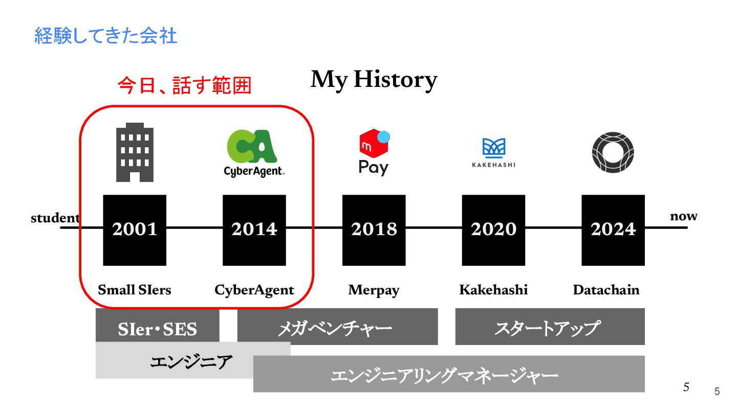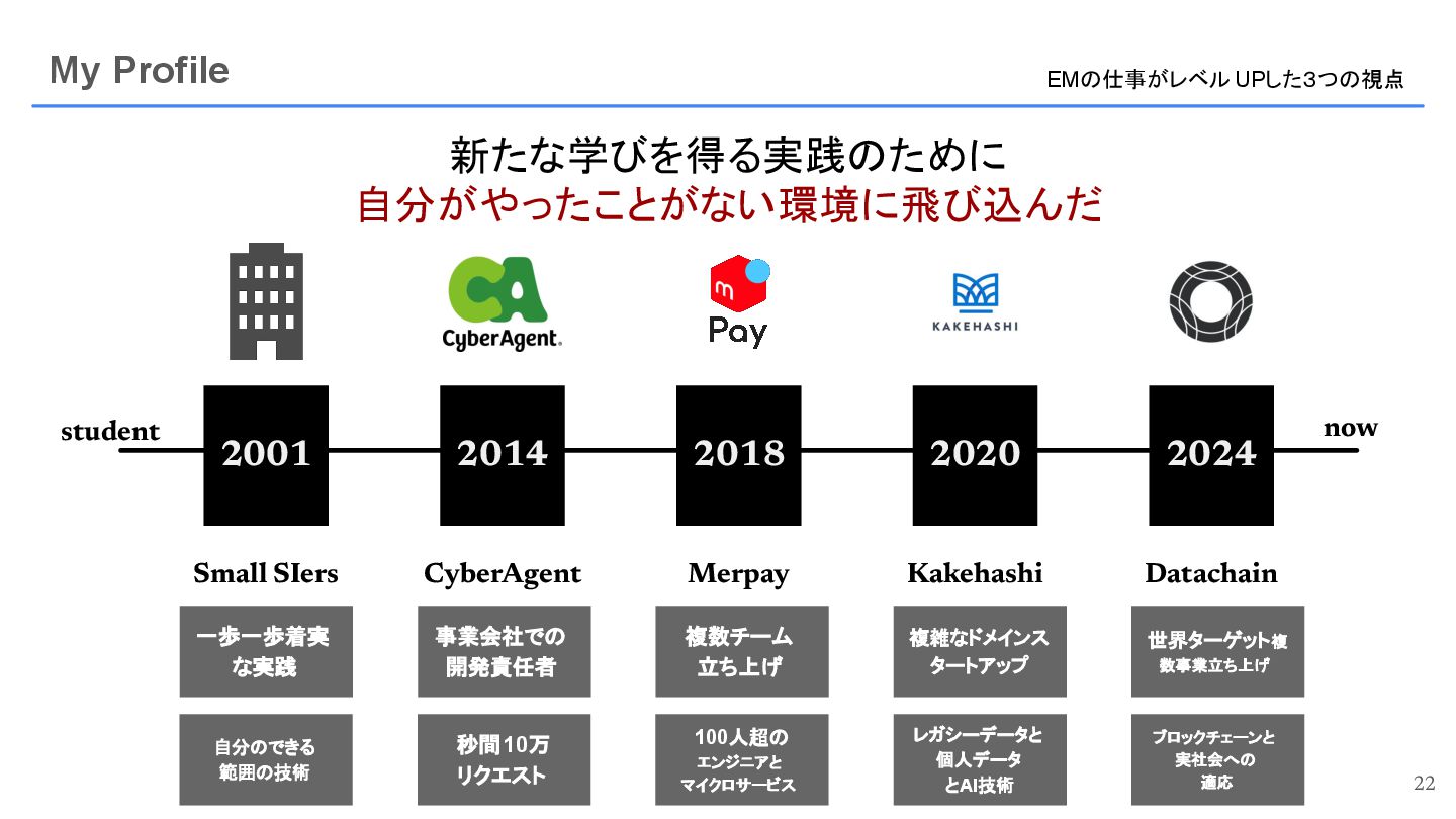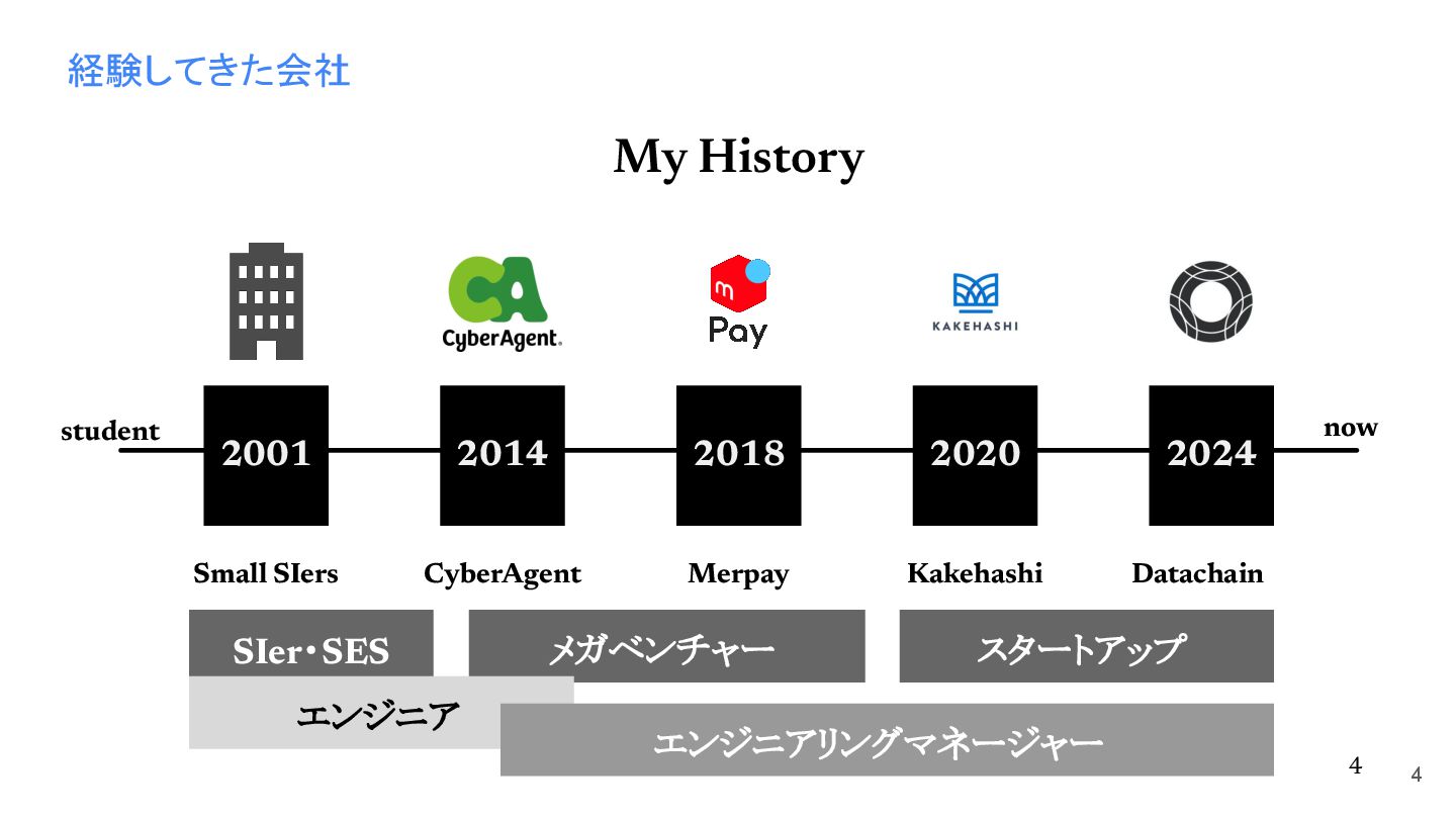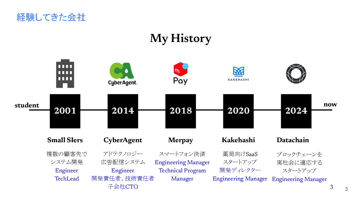 2014 スマートフォン決済 Engineering Manager Technical Program Manager 2018 薬局向けSaaS スタートアップ 開発ディレクター Engineering Manager 2020 2024 複数の顧客先で システム開発 Engineer TechLead ブロックチェーンを 実社会に適応する スタートアップ Engineering Manager CyberAgent Kakehashi Small SIers Merpay Datachain 3 now student