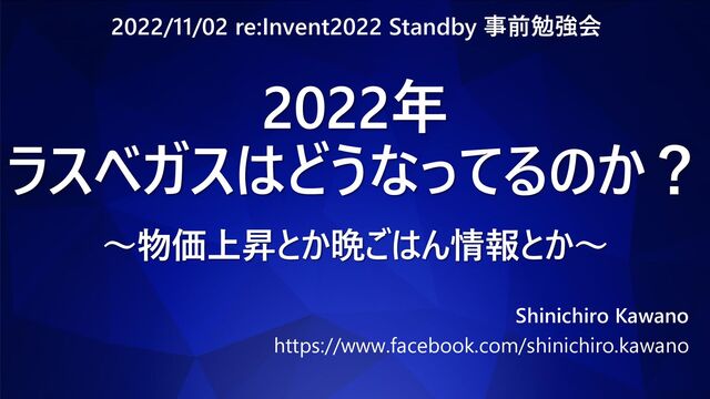 #reInvent2022stby 2022年 ラスベガスはどうなってるのか? ~物価上昇とか晩ごはん情報とか~ Shinichiro Kawano https://www.facebook.com/shinichiro.kawano 2022/11/02 re:Invent2022 Standby