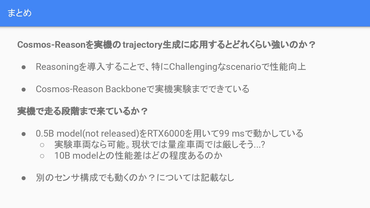 Cosmos-Reasonをbackboneとして用いるVLA自動運転モデルについての発表です。