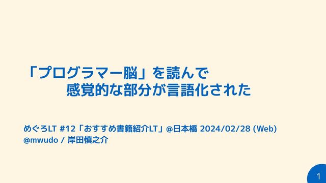 「プログラマー脳」を読んで 感覚的な部分が言語化された 1 めぐろLT #12「おすすめ書籍紹介LT」@日本橋 2024/02/28 (Web) @mwudo / 岸田慎之介