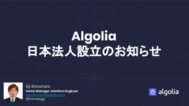 Algolia 日本法人設立のお知らせ Eiji Shinohara Senior Manager, Solutions Engineer