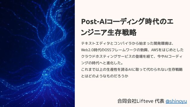 Post-AIコーディング時代のエ ンジニア生存戦略 テキストエディタとコンパイラから始まった開発環境は、 Web2.0時代のOSSフレームワークの勃興、AWSをはじめとした クラウドホスティングサービスの登場を経て、今やAIコーディ ングの時代へと進化した。 これまで以上の生産性を誇るAIに取って代わられない生存戦略 とはどのようなものだろうか 合同会社Lifteve 代表