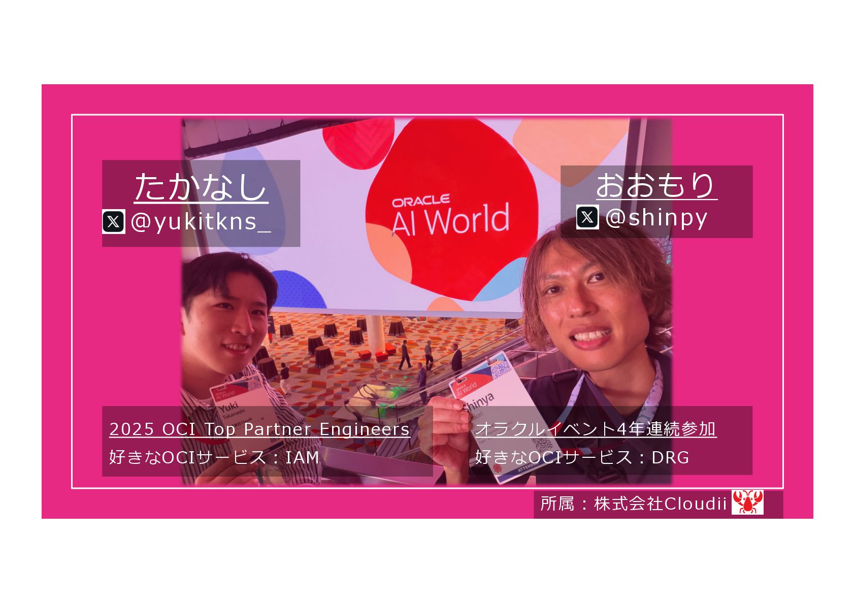 おおもり @shinpy たかなし @yukitkns_ 所属︓株式会社Cloudii オラクルイベント4年連続参加 好きなOCIサービス︓DRG 2025 OCI Top