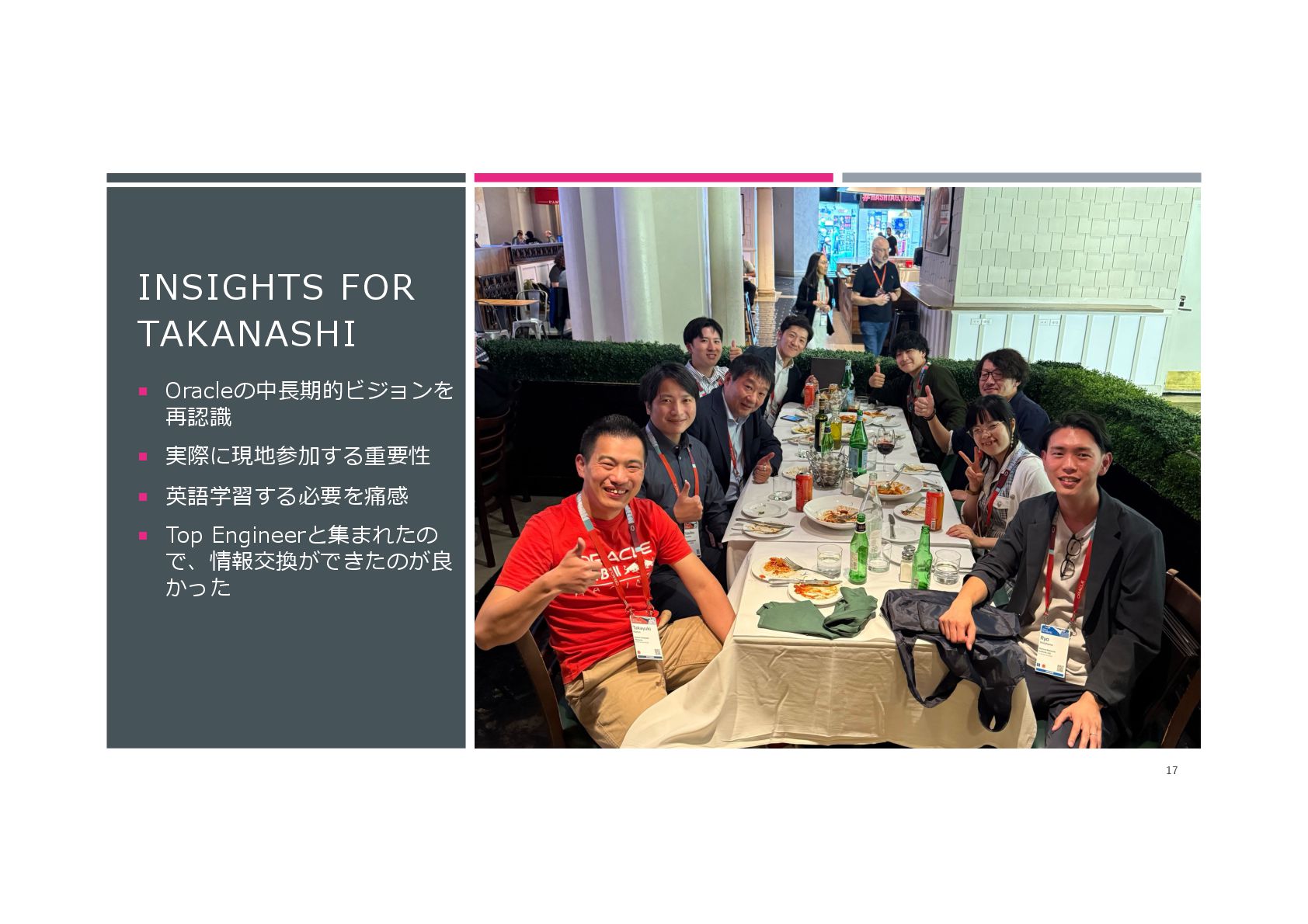 INSIGHTS FOR TAKANASHI ¡ Oracleの中⻑期的ビジョンを 再認識 ¡ 実際に現地参加する重要性 ¡ 英語学習する必要を痛感