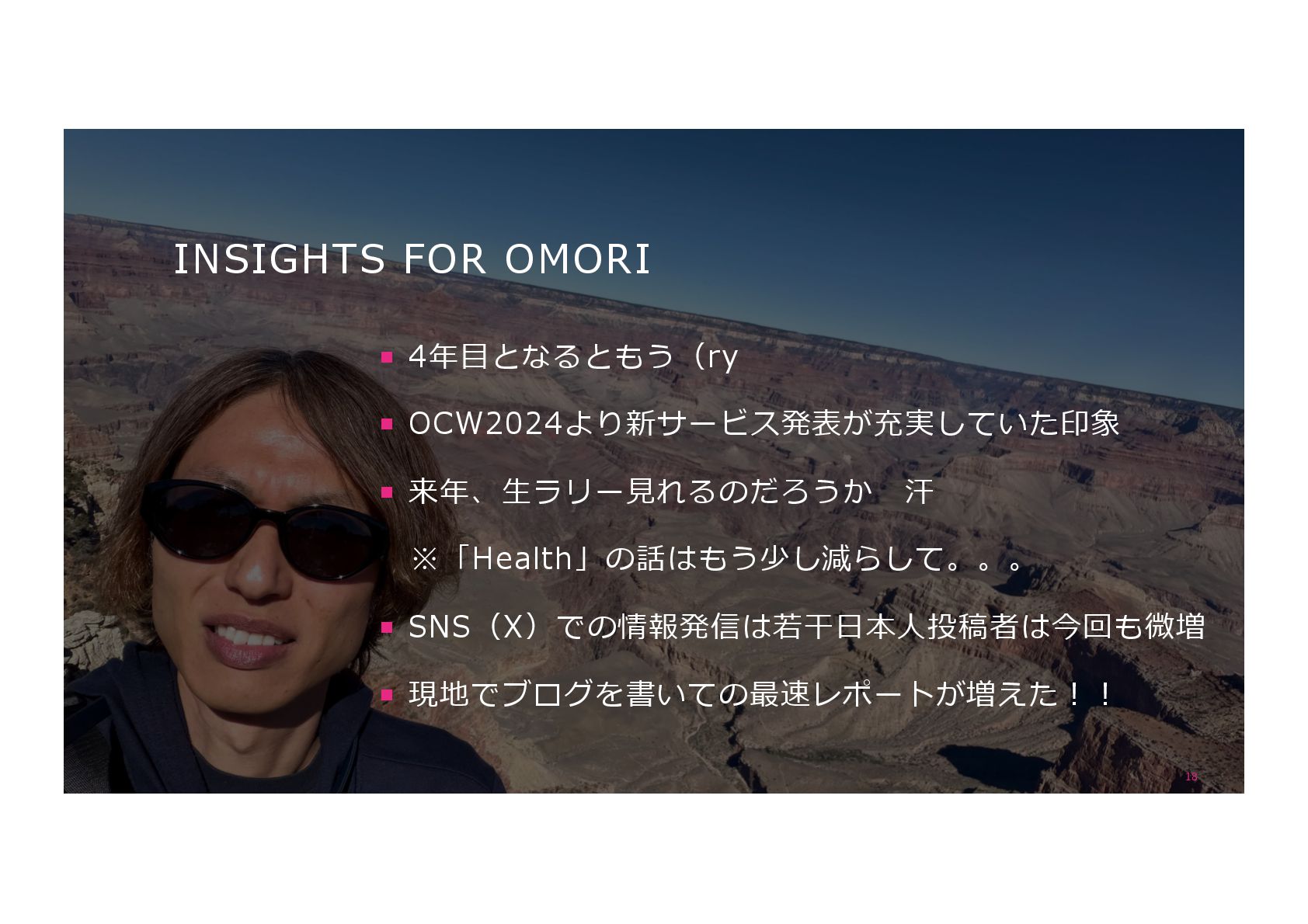 INSIGHTS FOR OMORI ¡ 4年⽬となるともう(ry ¡ OCW2024より新サービス発表が充実していた印象 ¡ 来年、⽣ラリー⾒れるのだろうか 汗
