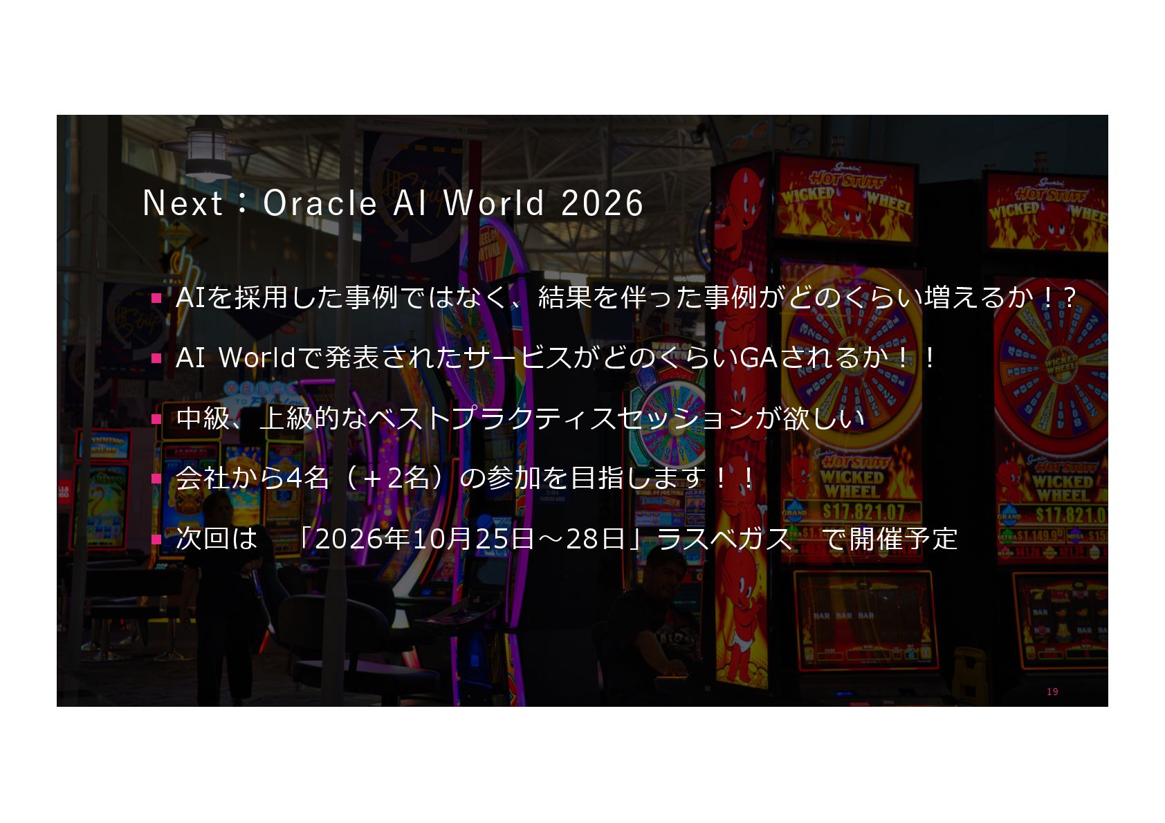 Next:Oracle AI World 2026 ¡ AIを採⽤した事例ではなく、結果を伴った事例がどのくらい増えるか︕? ¡ AI Worldで発表されたサービスがどのくらいGAされるか︕︕ ¡