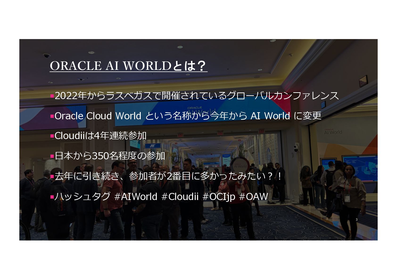 ORACLE AI WORLDとは? ¡2022年からラスベガスで開催されているグローバルカンファレンス ¡Oracle Cloud World という名称から今年から AI World