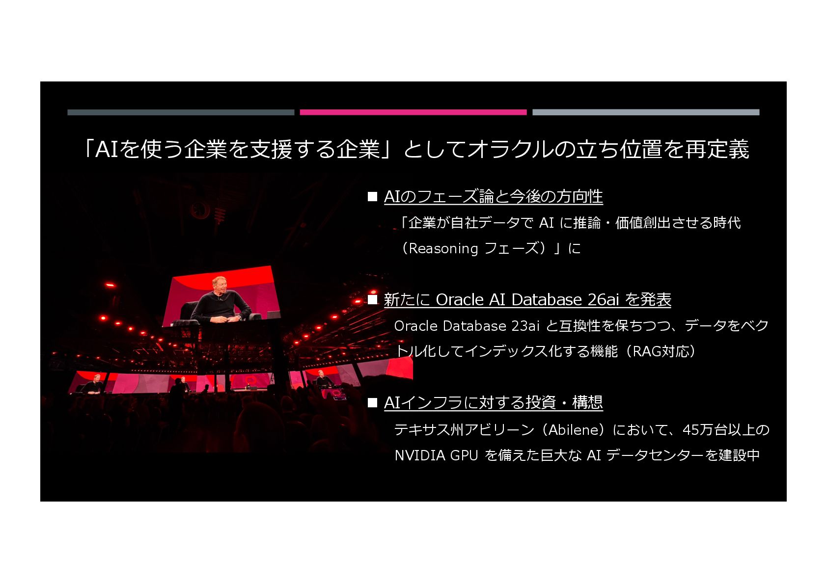 AI Database 26ai を発表 Oracle Database 23ai と互換性を保ちつつ、データをベク トル化してインデックス化する機能(RAG対応) n AIインフラに対する投資・構想 テキサス州アビリーン(Abilene)において、45万台以上の NVIDIA GPU を備えた巨⼤な AI データセンターを建設中 「AIを使う企業を⽀援する企業」としてオラクルの⽴ち位置を再定義