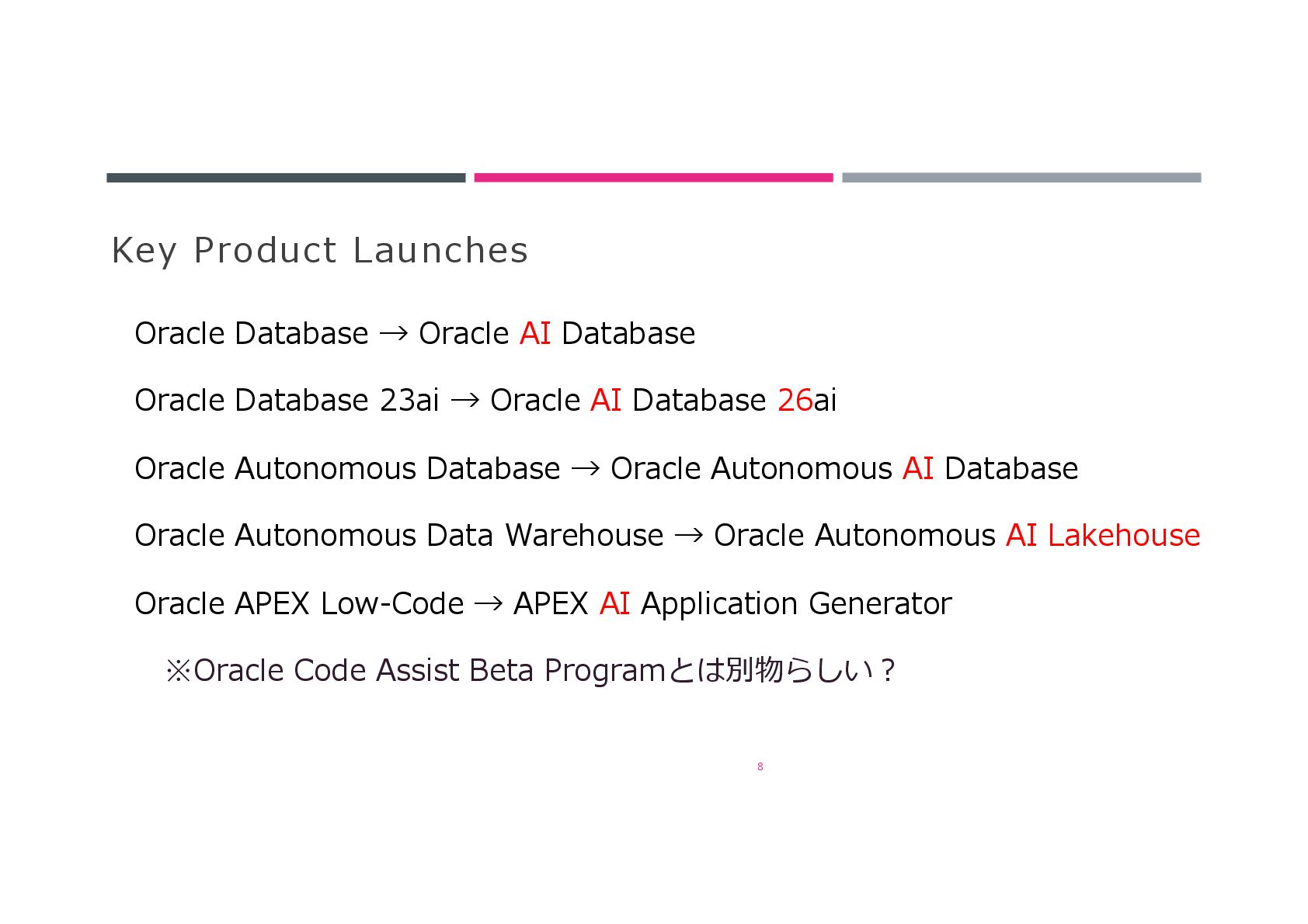 Oracle Database 23ai → Oracle AI Database 26ai Oracle Autonomous Database → Oracle Autonomous AI Database Oracle Autonomous Data Warehouse → Oracle Autonomous AI Lakehouse Oracle APEX Low-Code → APEX AI Application Generator ※Oracle Code Assist Beta Programとは別物らしい︖