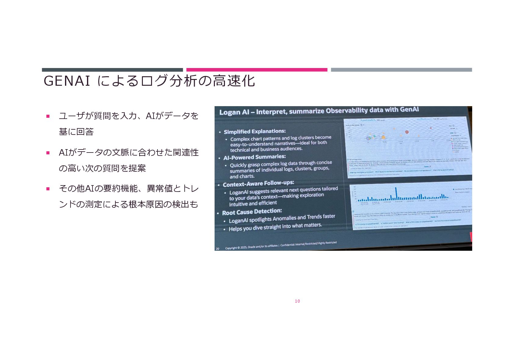 GENAI によるログ分析の⾼速化 ¡ ユーザが質問を⼊⼒、AIがデータを 基に回答 ¡ AIがデータの⽂脈に合わせた関連性 の⾼い次の質問を提案 ¡ その他AIの要約機能、異常値とトレ