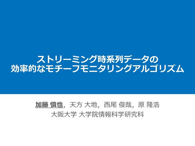 ストリーミング時系列データの 効率的なモチーフモニタリングアルゴリズム 加藤 慎也,天方 大地,西尾 俊哉,原 隆浩 大阪大学 大学院情報科学研究科