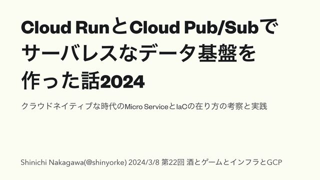 Cloud RunͱCloud Pub/SubͰ αʔόϨεͳσʔλج൫Λ ࡞ͬͨ2024 ΫϥυωΠςΟϒͳ࣌ͷMicro ServiceͱIaCͷࡏΓํͷߟͱ࣮ફ Shinichi Nakagawa(@shinyorke) 2024/3/8