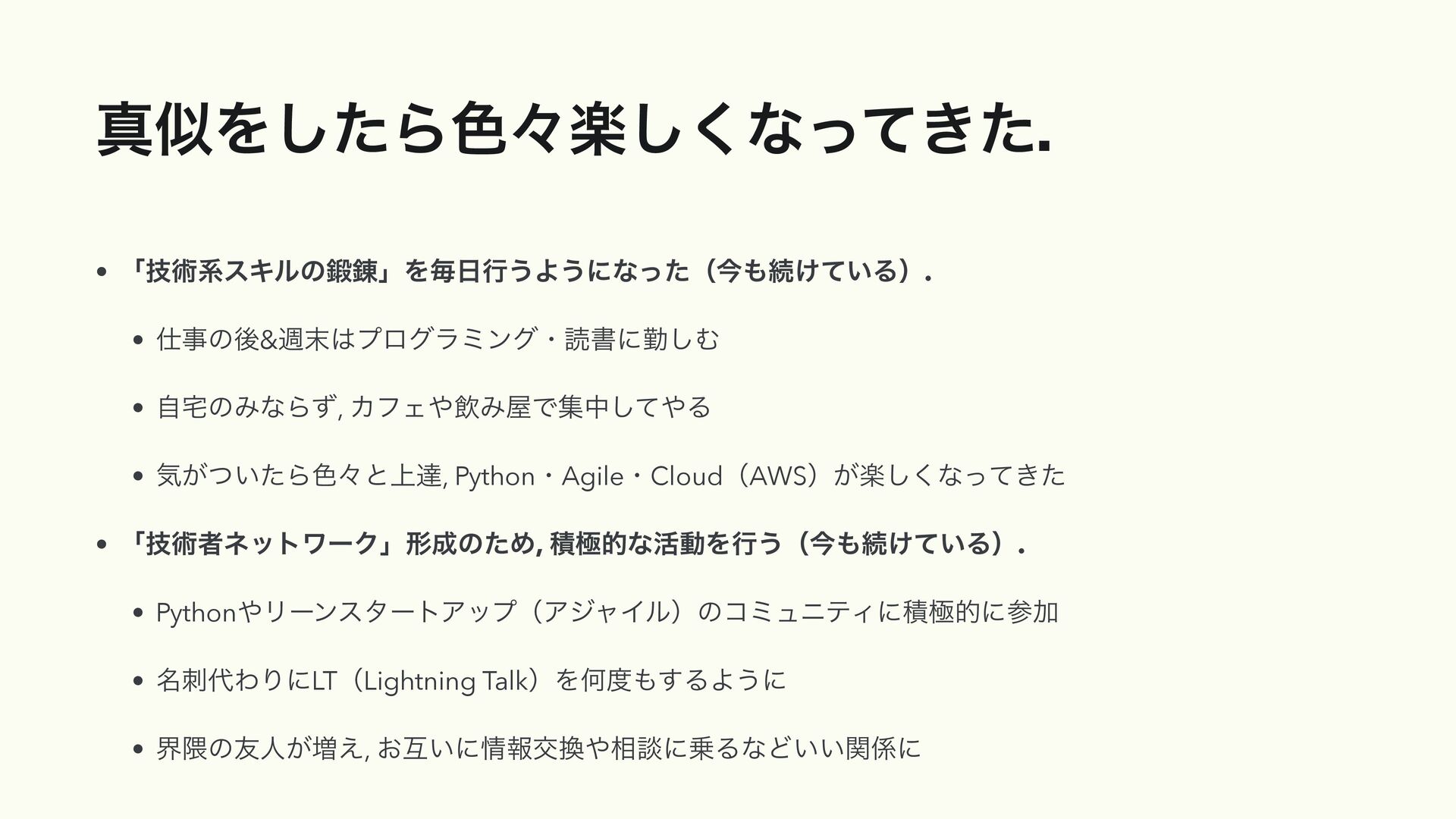 PythonɾAgileɾCloudʢAWSʣָ͕͘͠ͳ͖ͬͯͨ • ʮٕज़ऀωοτϫʔΫʯܗͷͨΊ, ੵۃతͳ׆ಈΛߦ͏ʢࠓଓ͚͍ͯΔʣ. • PythonϦʔϯελʔτΞοϓʢΞδϟΠϧʣͷίϛϡχςΟʹੵۃతʹࢀՃ • ໊ΘΓʹLTʢLightning TalkʣΛԿ͢ΔΑ͏ʹ • ք۾ͷ༑ਓ͕૿͑, ͓ޓ͍ʹใަ૬ஊʹΔͳͲ͍͍ؔʹ
