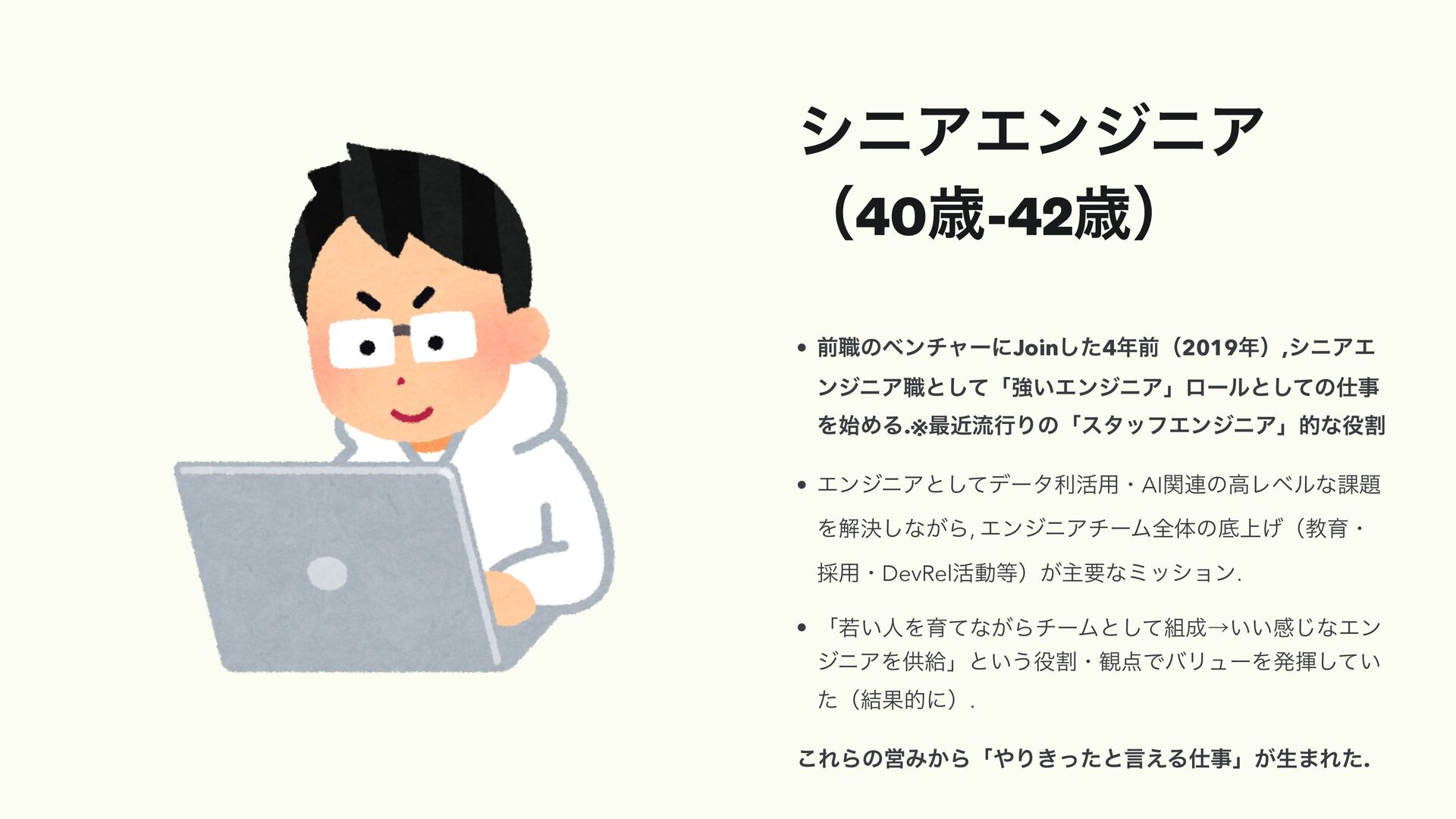 γχΞΤϯδχΞ ʢ40ࡀ-42ࡀʣ • લ৬ͷϕϯνϟʔʹJoinͨ͠4લʢ2019ʣ,γχΞΤ ϯδχΞ৬ͱͯ͠ʮڧ͍ΤϯδχΞʯϩʔϧͱͯ͠ͷࣄ Λ࢝ΊΔ.※࠷ۙྲྀߦΓͷʮελοϑΤϯδχΞʯతͳׂ • ΤϯδχΞͱͯ͠σʔλར׆༻ɾAIؔ࿈ͷߴϨϕϧͳ՝ Λղܾ͠ͳ͕Β, ΤϯδχΞνʔϜશମͷఈ্͛ʢڭҭɾ