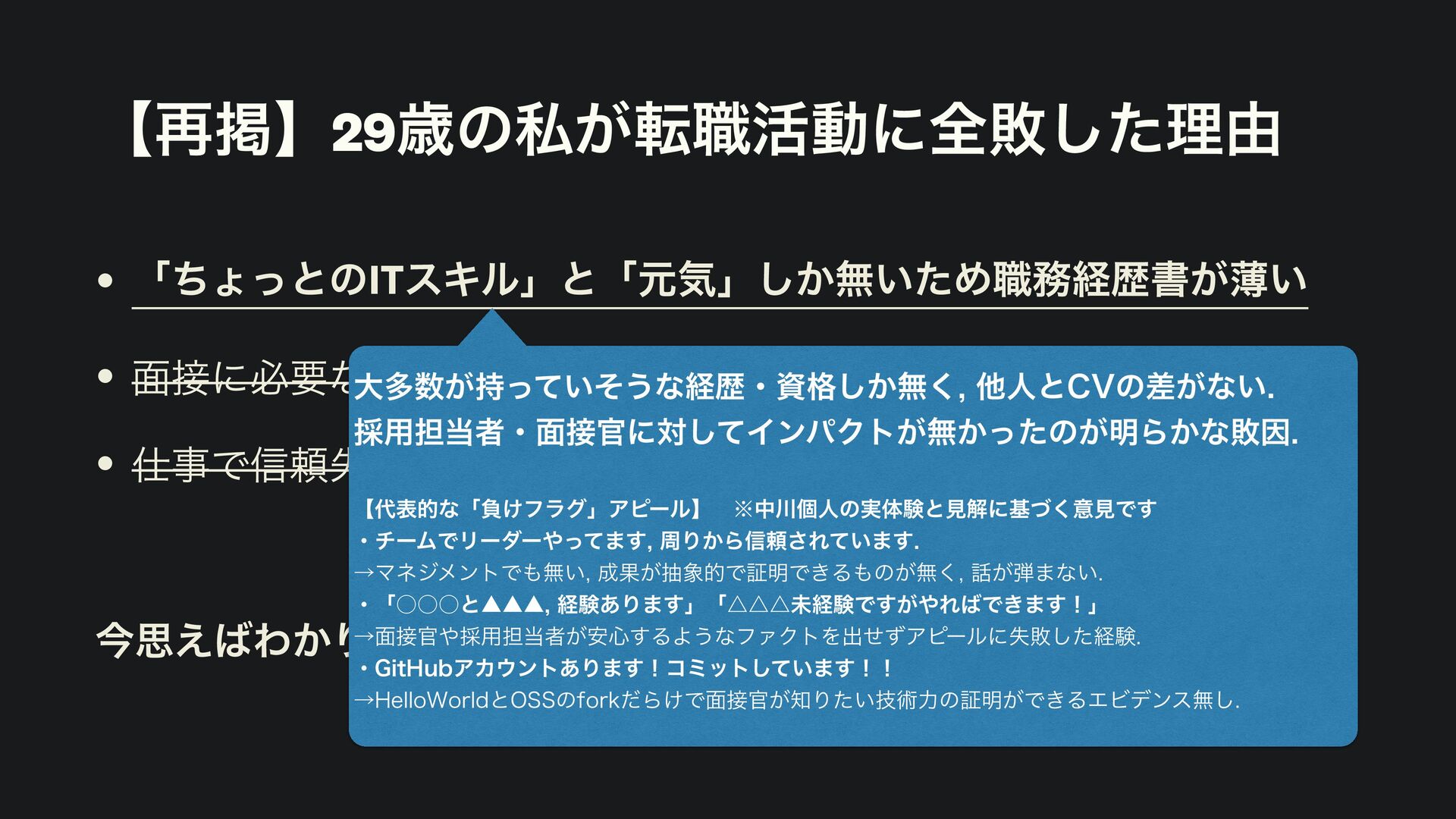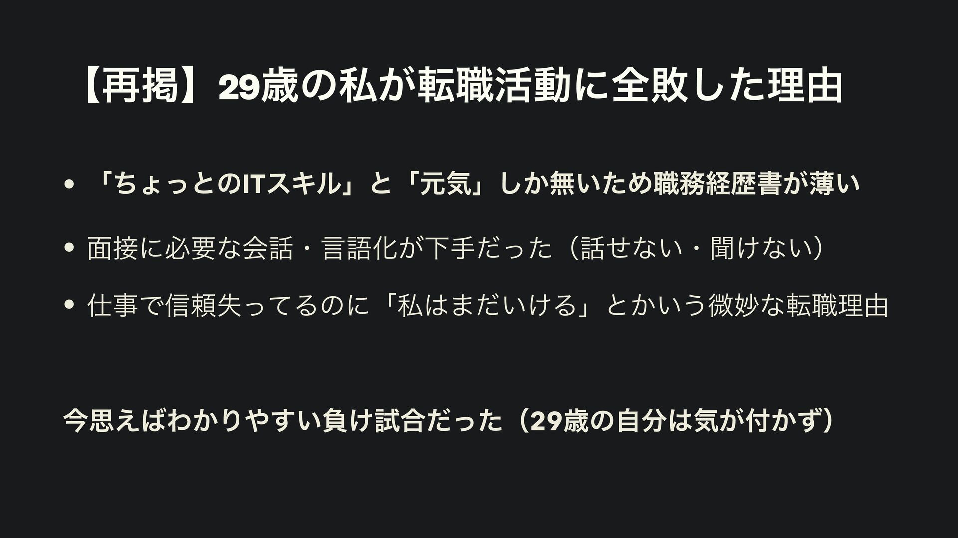 ʲ࠶ܝʳ29ࡀͷࢲ͕స৬׆ಈʹશഊͨ͠ཧ༝ • ʮͪΐͬͱͷITεΩϧʯͱʮݩؾʯ͔͠ແ͍ͨΊ৬ܦྺॻ͕ബ͍ • ໘ʹඞཁͳձɾݴޠԽ͕Լखͩͬͨʢͤͳ͍ɾฉ͚ͳ͍ʣ • ࣄͰ৴པࣦͬͯΔͷʹʮࢲ·͍͚ͩΔʯͱ͔͍͏ඍົͳస৬ཧ༝ ࠓࢥ͑Θ͔Γ͍͢ෛ͚ࢼ߹ͩͬͨʢ29ࡀͷࣗؾ͕͔ͣʣ