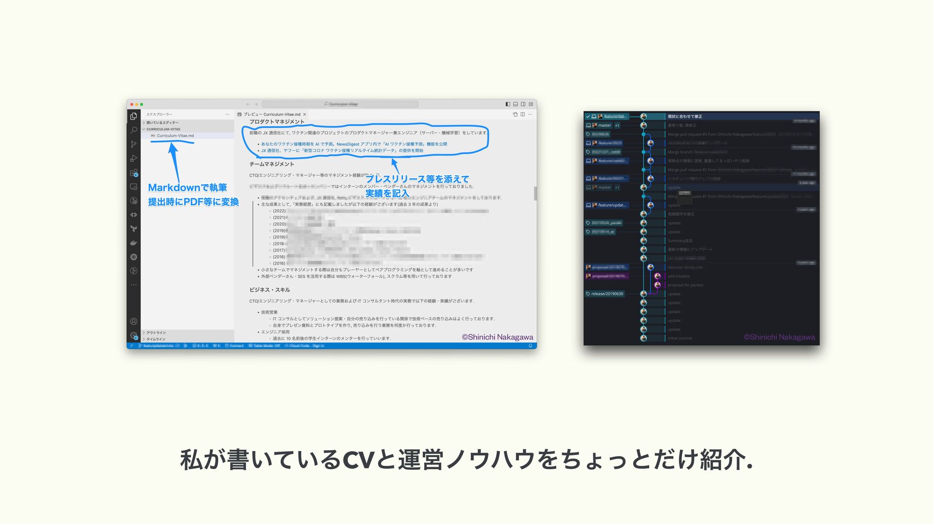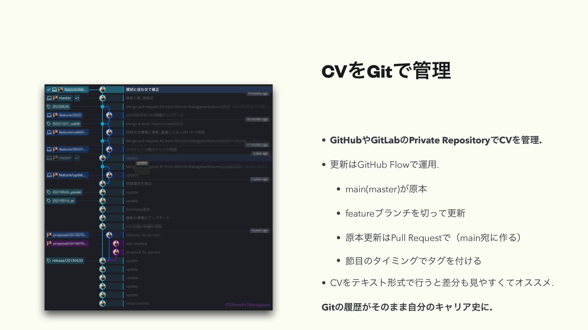 featureϒϥϯνΛͬͯߋ৽ • ݪຊߋ৽Pull RequestͰʢmainѼʹ࡞Δʣ • અͷλΠϛϯάͰλάΛ͚Δ • CVΛςΩετܗࣜͰߦ͏ͱࠩݟͯ͘͢Φεεϝ. Gitͷཤྺ͕ͦͷ··ࣗͷΩϟϦΞ࢙ʹ. ©Shinichi Nakagawa