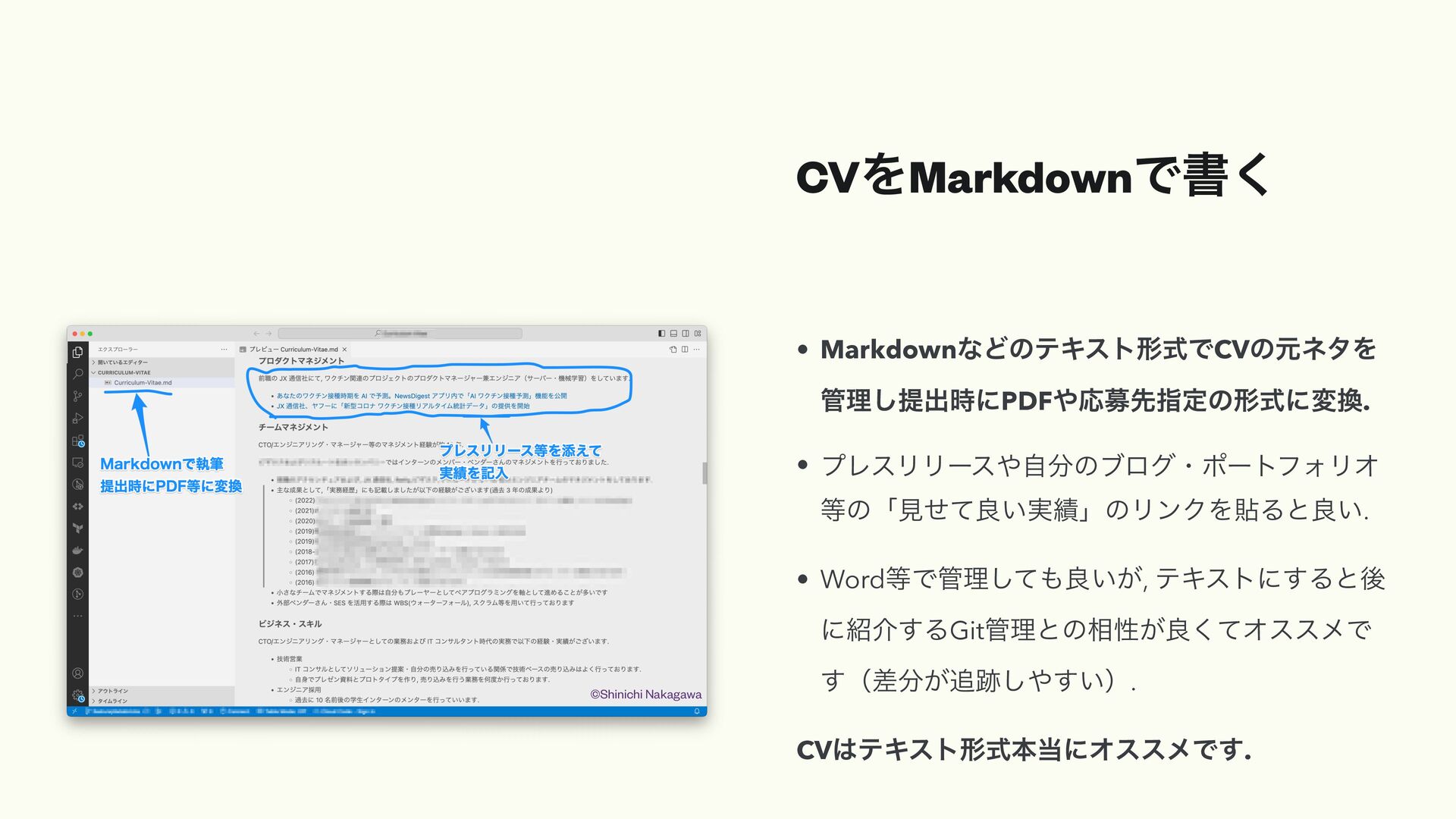 CVΛMarkdownͰॻ͘ • MarkdownͳͲͷςΩετܗࣜͰCVͷݩωλΛ ཧ͠ఏग़࣌ʹPDFԠืઌࢦఆͷܗࣜʹม. • ϓϨεϦϦʔεࣗͷϒϩάɾϙʔτϑΥϦΦ ͷʮݟͤͯྑ͍࣮ʯͷϦϯΫΛషΔͱྑ͍. • WordͰཧͯ͠ྑ͍͕, ςΩετʹ͢Δͱޙ
