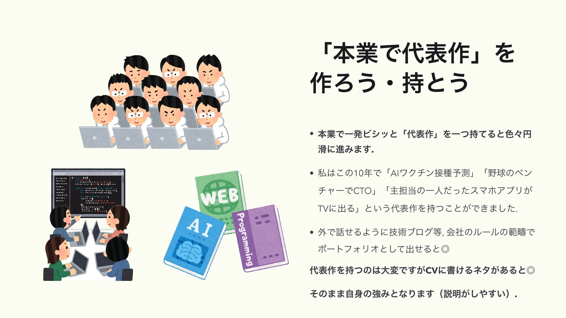 ʮຊۀͰද࡞ʯΛ ࡞Ζ͏ɾ࣋ͱ͏ • ຊۀͰҰൃϏγοͱʮද࡞ʯΛҰͭ࣋ͯΔͱ৭ʑԁ ʹਐΈ·͢. • ࢲ͜ͷ10ͰʮAIϫΫνϯछ༧ଌʯʮٿͷϕϯ νϟʔͰCTOʯʮओ୲ͷҰਓͩͬͨεϚϗΞϓϦ͕ TVʹग़Δʯͱ͍͏ද࡞Λ࣋ͭ͜ͱ͕Ͱ͖·ͨ͠. •
