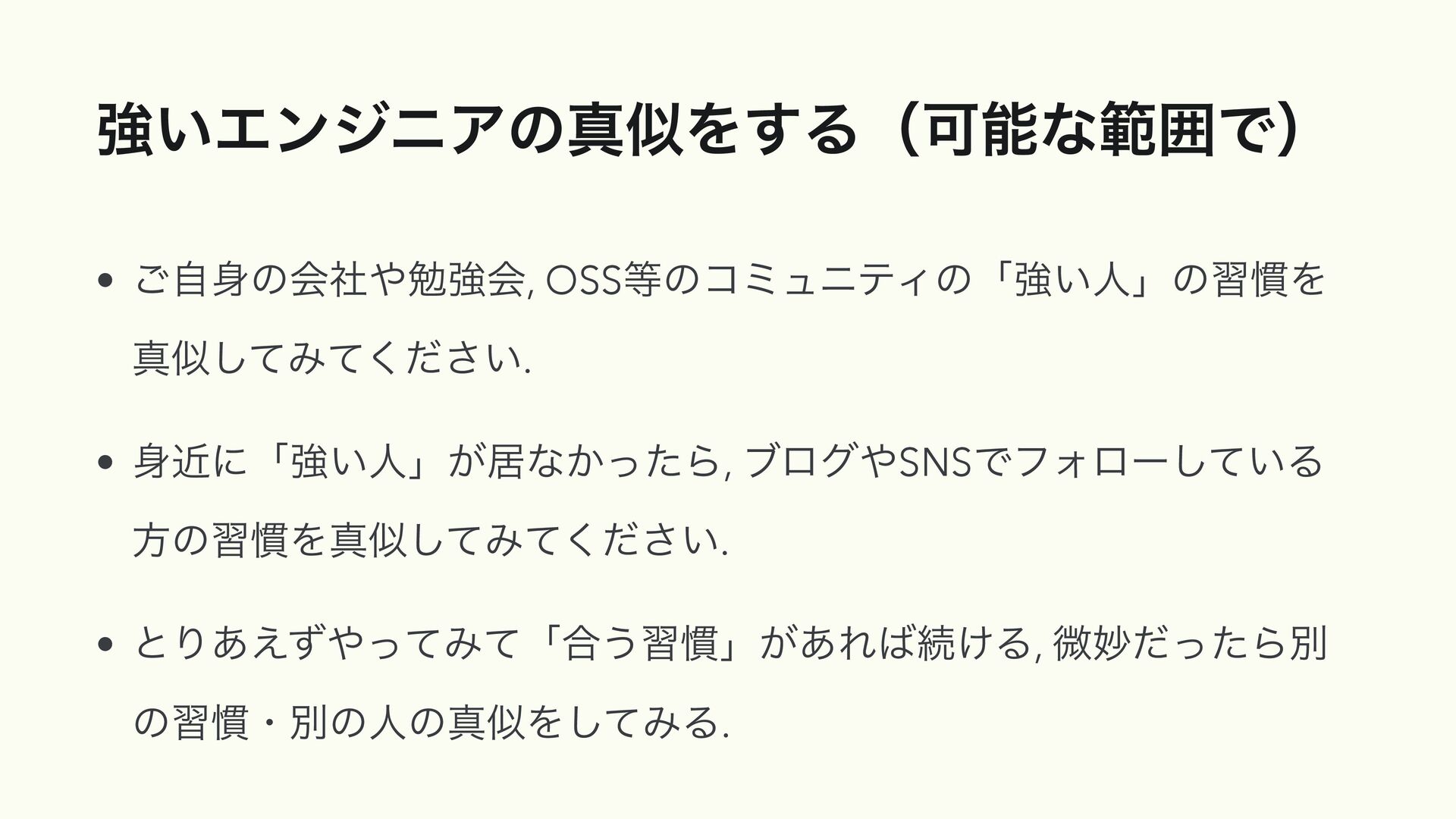 ڧ͍ΤϯδχΞͷਅࣅΛ͢ΔʢՄೳͳൣғͰʣ • ࣗ͝ͷձࣾษڧձ, OSSͷίϛϡχςΟͷʮڧ͍ਓʯͷश׳Λ ਅࣅͯ͠Έ͍ͯͩ͘͞. • ۙʹʮڧ͍ਓʯ͕ډͳ͔ͬͨΒ, ϒϩάSNSͰϑΥϩʔ͍ͯ͠Δ ํͷश׳Λਅࣅͯ͠Έ͍ͯͩ͘͞. •