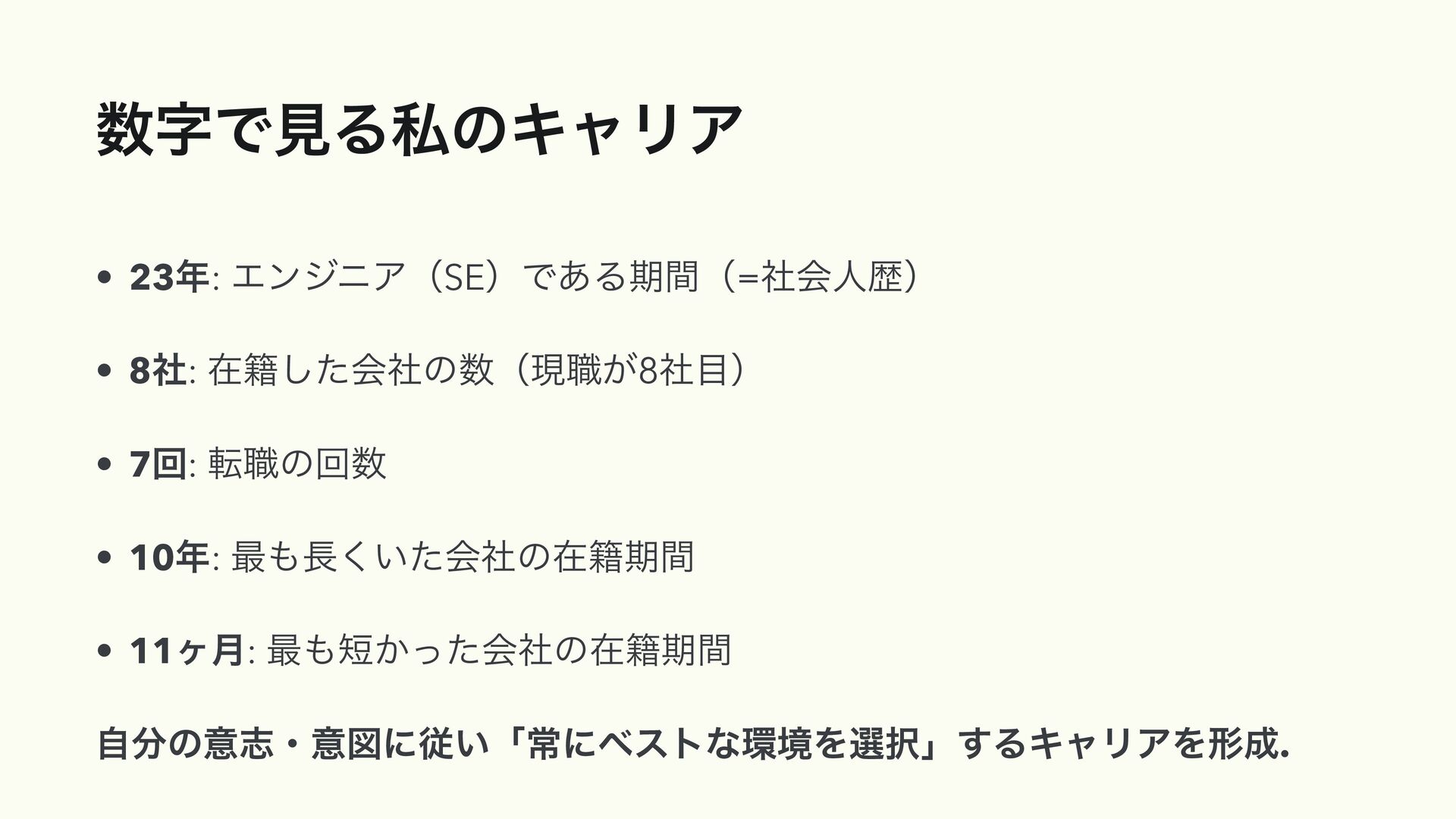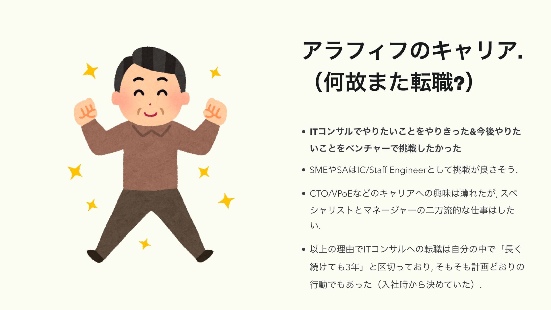 ΞϥϑΟϑͷΩϟϦΞ. ʢԿނ·ͨస৬?ʣ • ITίϯαϧͰΓ͍ͨ͜ͱΛΓ͖ͬͨ&ࠓޙΓͨ ͍͜ͱΛϕϯνϟʔͰઓ͔ͨͬͨ͠ • SMESAIC/Staff Engineerͱͯ͠ઓ͕ྑͦ͞͏. • CTO/VPoEͳͲͷΩϟϦΞͷڵຯബΕ͕ͨ,