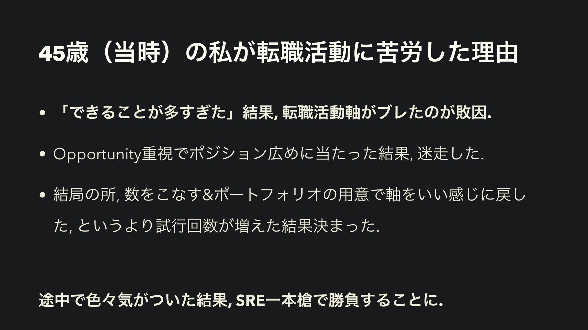 45ࡀʢ࣌ʣͷࢲ͕స৬׆ಈʹۤ࿑ͨ͠ཧ༝ • ʮͰ͖Δ͜ͱ͕ଟ͗ͨ͢ʯ݁Ռ, స৬׆ಈ͕࣠ϒϨͨͷ͕ഊҼ. • OpportunityॏࢹͰϙδγϣϯΊʹͨͬͨ݁Ռ, ໎ͨ͠. • ݁ہͷॴ, Λ͜ͳ͢&ϙʔτϑΥϦΦͷ༻ҙͰ࣠Λ͍͍ײ͡ʹ͠