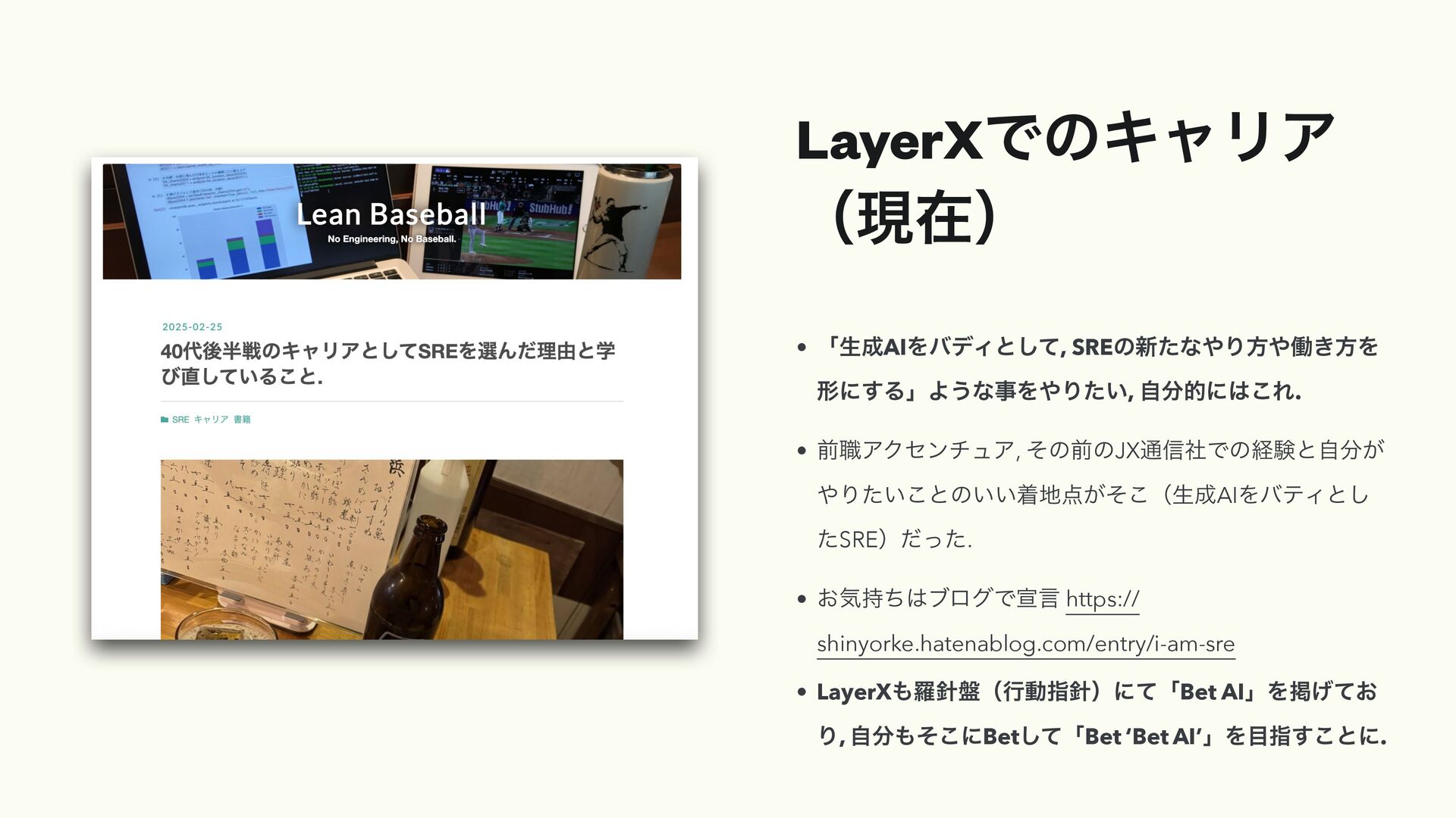 Γ͍ͨ͜ͱͷ͍͍ண͕ͦ͜ʢੜAIΛόςΟͱ͠ ͨSREʣͩͬͨ. • ͓ؾ࣋ͪϒϩάͰએݴ https:// shinyorke.hatenablog.com/entry/i-am-sre • LayerXཏ൫ʢߦಈࢦʣʹͯʮBet AIʯΛܝ͓͛ͯ Γ, ࣗͦ͜ʹBetͯ͠ʮBet ‘Bet AI’ʯΛࢦ͢͜ͱʹ.