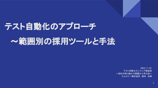 テスト自動化のアプローチ ~範囲別の採用ツールと手法 2024/11/22 テスト自動化エンジニア勉強会 ~各社の取り組みや課題から学ぶ会~ エムスリー株式会社 城本 由希