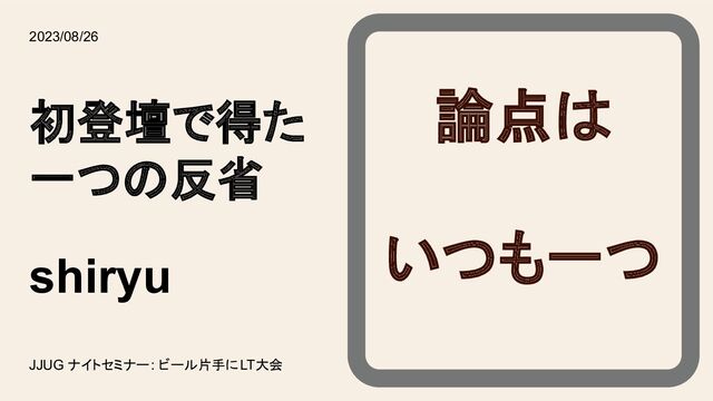 JJUG ナイトセミナー: ビール片手にLT大会 shiryu 初登壇で得た 一つの反省 2023/08/26 論点は いつも一つ