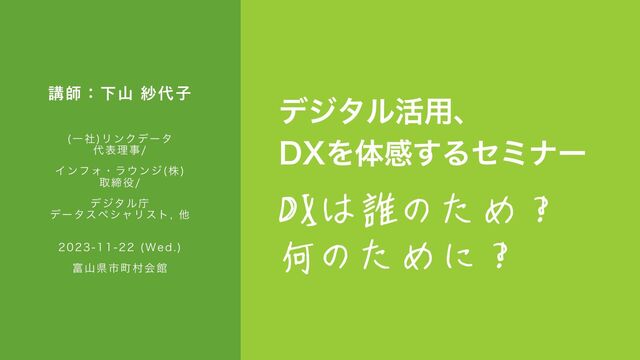 2023年11月22日に富山県市町村会館で開催された富山県・市町村DX研修におけるインプットパートの資料です。