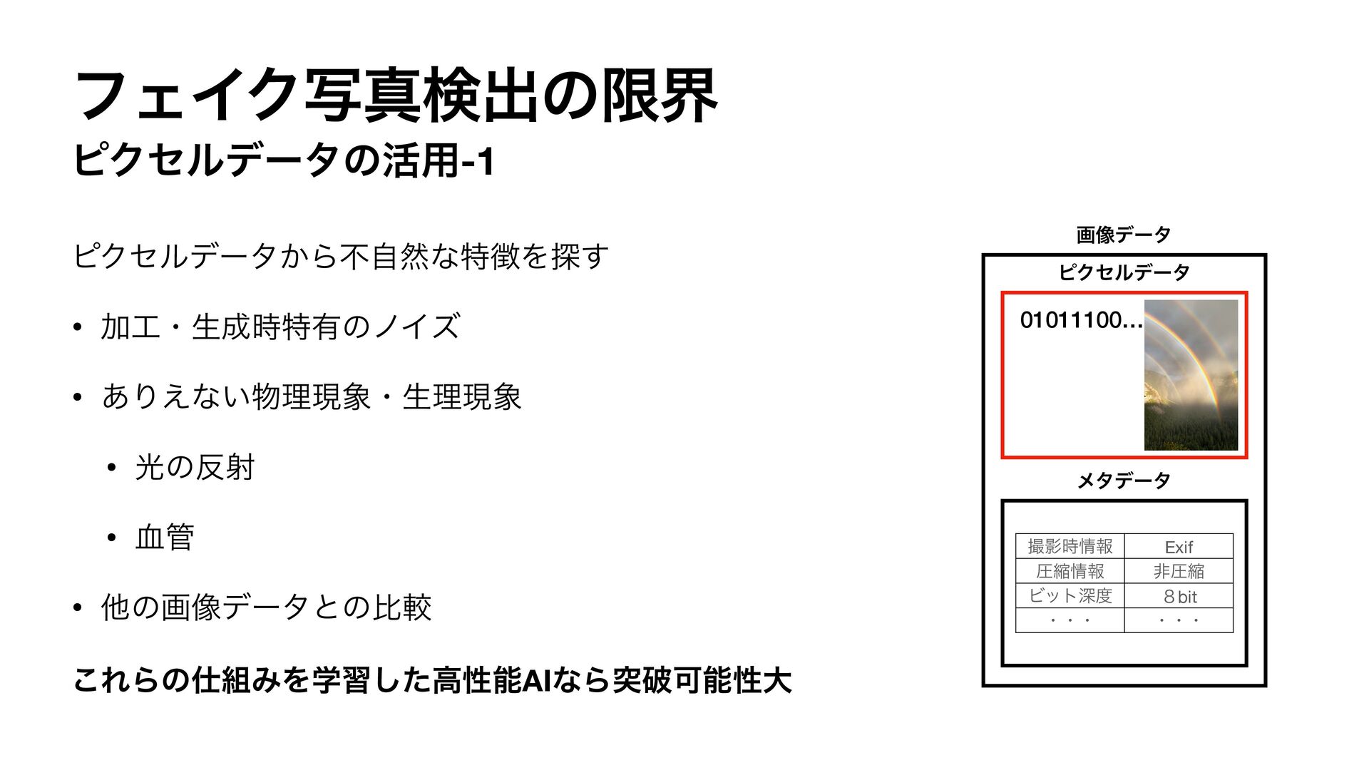 ݂ • ଞͷը૾σʔλͱͷൺֱ ͜ΕΒͷΈΛֶशͨ͠ߴੑೳAIͳΒಥഁՄೳੑେ ը૾σʔλ 001011100… ϐΫηϧσʔλ ϝλσʔλ ࡱӨ࣌ใ Exif ѹॖใ ඇѹॖ Ϗοτਂ ̔bit ɾɾɾ ɾɾɾ