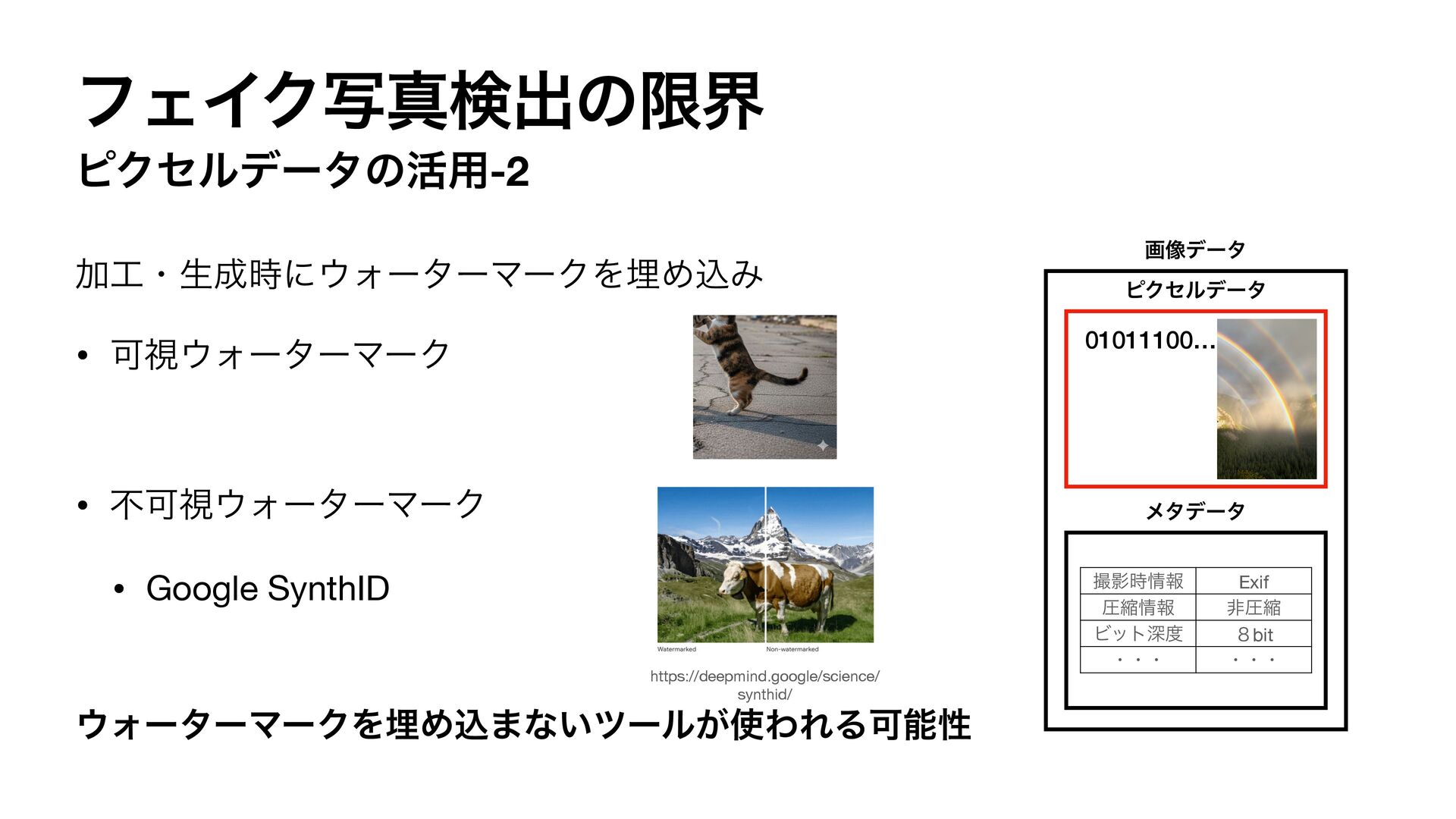 ϑΣΠΫࣸਅݕग़ͷݶք ϐΫηϧσʔλͷ׆༻-2 Ճɾੜ࣌ʹΥʔλʔϚʔΫΛຒΊࠐΈ • ՄࢹΥʔλʔϚʔΫ • ෆՄࢹΥʔλʔϚʔΫ • Google SynthID