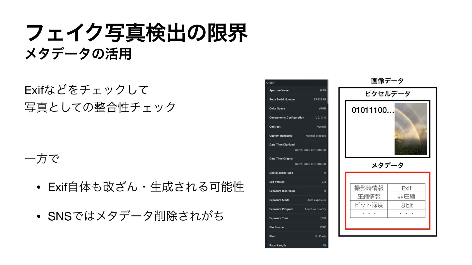 001011100… ϐΫηϧσʔλ ϝλσʔλ ࡱӨ࣌ใ Exif ѹॖใ ඇѹॖ Ϗοτਂ ̔bit ɾɾɾ ɾɾɾ