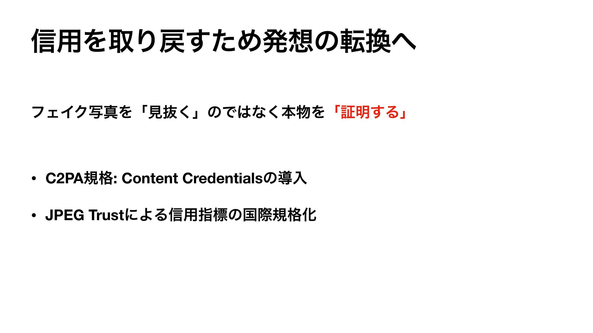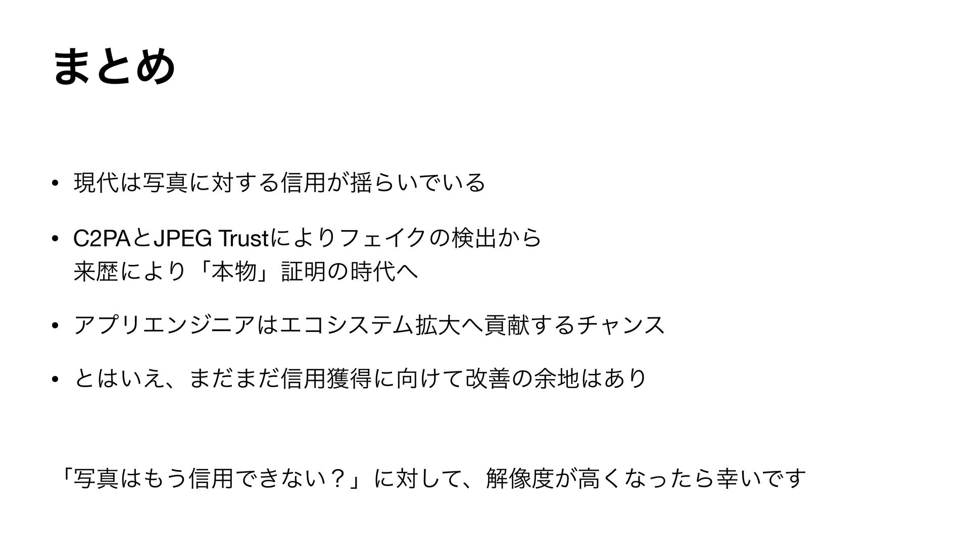 ·ͱΊ • ݱࣸਅʹର͢Δ৴༻͕༳Β͍Ͱ͍Δ • C2PAͱJPEG TrustʹΑΓϑΣΠΫͷݕग़͔Β དྷྺʹΑΓʮຊʯূ໌ͷ࣌ • ΞϓϦΤϯδχΞΤίγεςϜ֦େߩݙ͢Δνϟϯε •