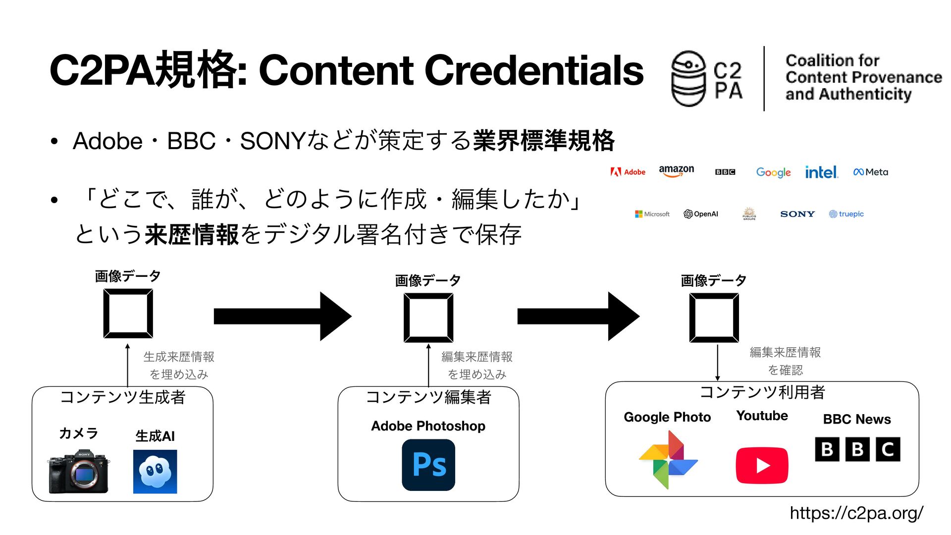 ͱ͍͏དྷྺใΛσδλϧॺ໊͖Ͱอଘ Χϝϥ ੜAI Adobe Photoshop Google Photo Youtube ը૾σʔλ ը૾σʔλ ը૾σʔλ ੜདྷྺใ ΛຒΊࠐΈ ฤूདྷྺใ ΛຒΊࠐΈ ฤूདྷྺใ Λ֬ೝ BBC News https://c2pa.org/