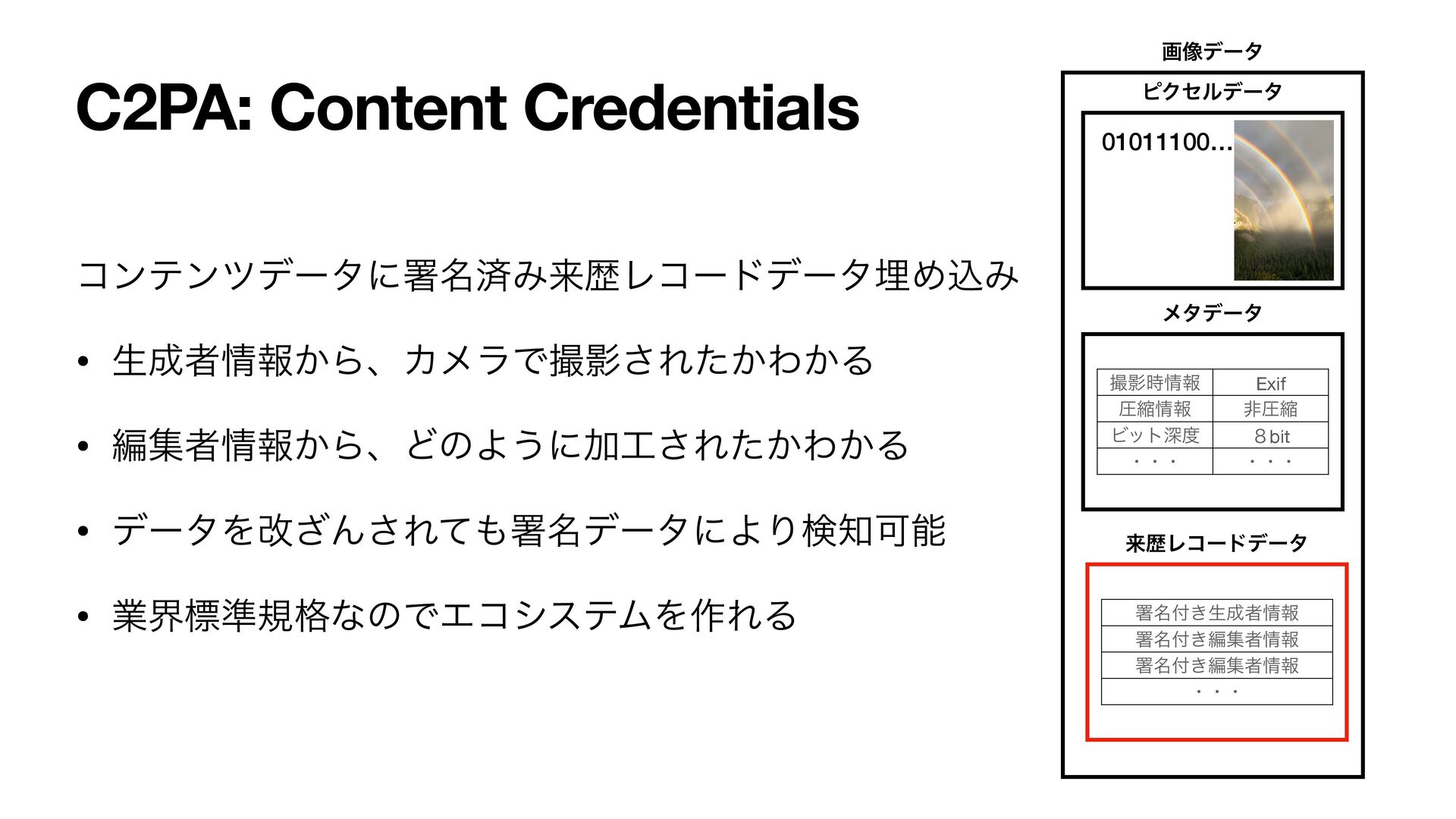 C2PA: Content Credentials ίϯςϯπσʔλʹॺ໊ࡁΈདྷྺϨίʔυσʔλຒΊࠐΈ • ੜऀใ͔ΒɺΧϝϥͰࡱӨ͞Ε͔ͨΘ͔Δ • ฤूऀใ͔ΒɺͲͷΑ͏ʹՃ͞Ε͔ͨΘ͔Δ • σʔλΛվ͟Μ͞Εͯॺ໊σʔλʹΑΓݕՄೳ