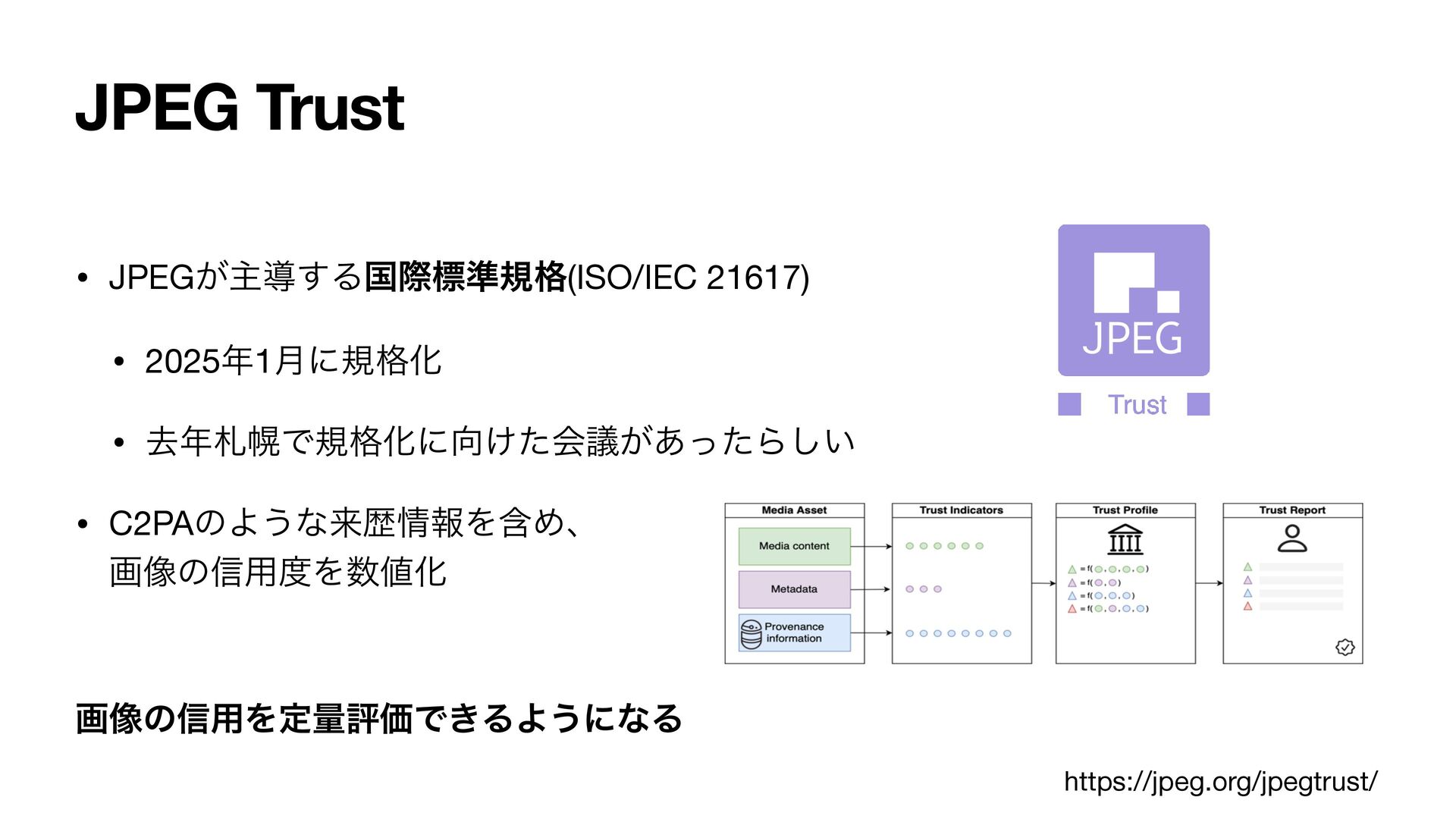 C2PAͷΑ͏ͳདྷྺใΛؚΊɺ ը૾ͷ৴༻ΛԽ ը૾ͷ৴༻ΛఆྔධՁͰ͖ΔΑ͏ʹͳΔ https://jpeg.org/jpegtrust/