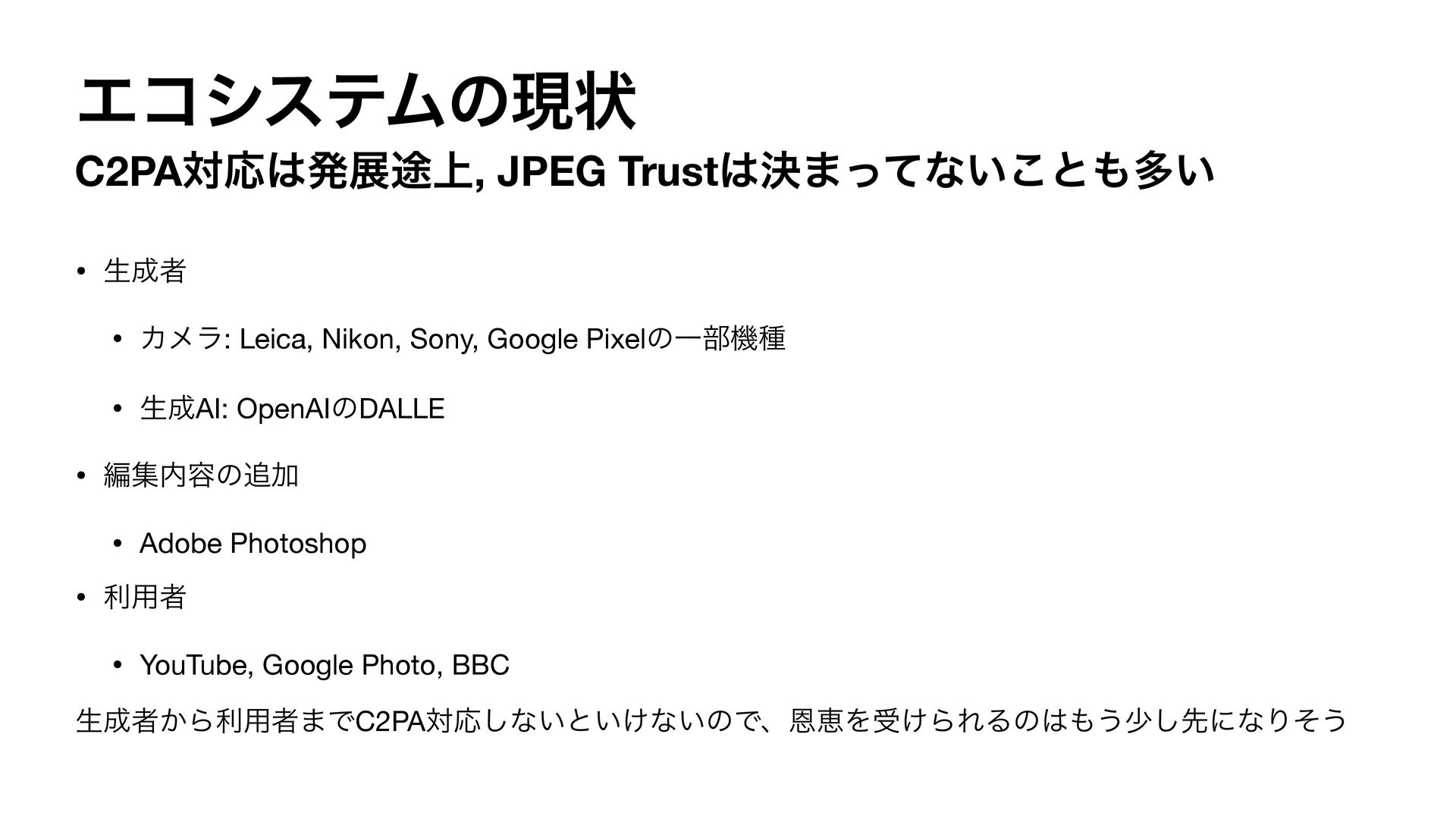 Sony, Google PixelͷҰ෦ػछ • ੜAI: OpenAIͷDALLE • ฤू༰ͷՃ • Adobe Photoshop • ར༻ऀ • YouTube, Google Photo, BBC ੜऀ͔Βར༻ऀ·ͰC2PAରԠ͠ͳ͍ͱ͍͚ͳ͍ͷͰɺԸܙΛड͚ΒΕΔͷ͏গ͠ઌʹͳΓͦ͏