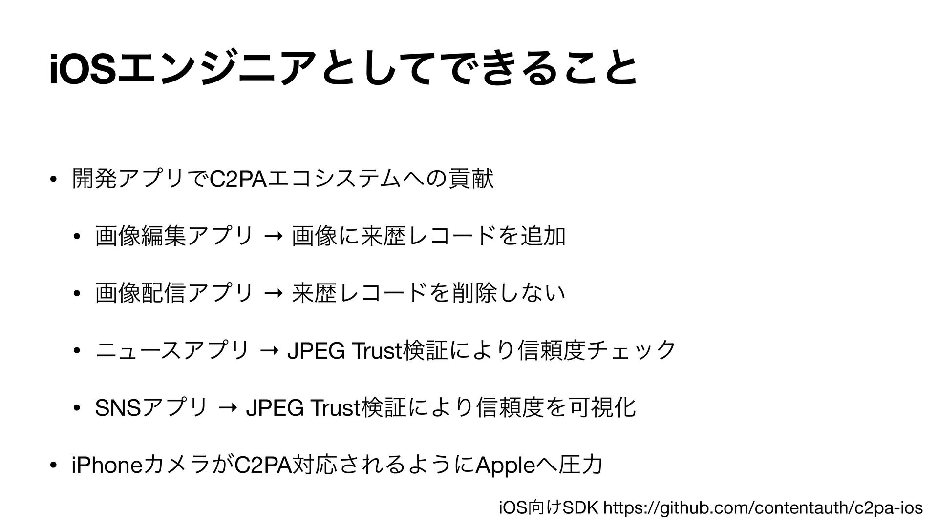 དྷྺϨίʔυΛআ͠ͳ͍ • χϡʔεΞϓϦ → JPEG TrustݕূʹΑΓ৴པνΣοΫ • SNSΞϓϦ → JPEG TrustݕূʹΑΓ৴པΛՄࢹԽ • iPhoneΧϝϥ͕C2PAରԠ͞ΕΔΑ͏ʹAppleѹྗ iOS͚SDK https://github.com/contentauth/c2pa-ios