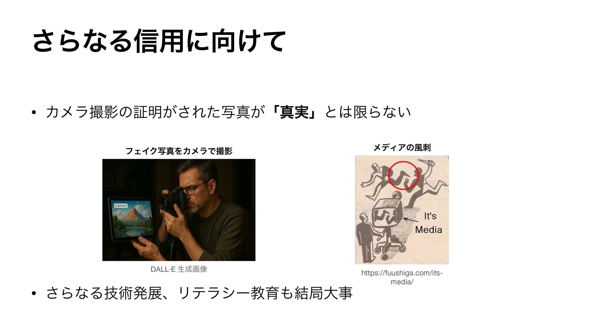 ͞ΒͳΔ৴༻ʹ͚ͯ • ΧϝϥࡱӨͷূ໌͕͞Εͨࣸਅ͕ʮਅ࣮ʯͱݶΒͳ͍ • ͞ΒͳΔٕज़ൃలɺϦςϥγʔڭҭ݁ہେࣄ DALL·E ੜը૾ ϑΣΠΫࣸਅΛΧϝϥͰࡱӨ https://fuushiga.com/its- media/