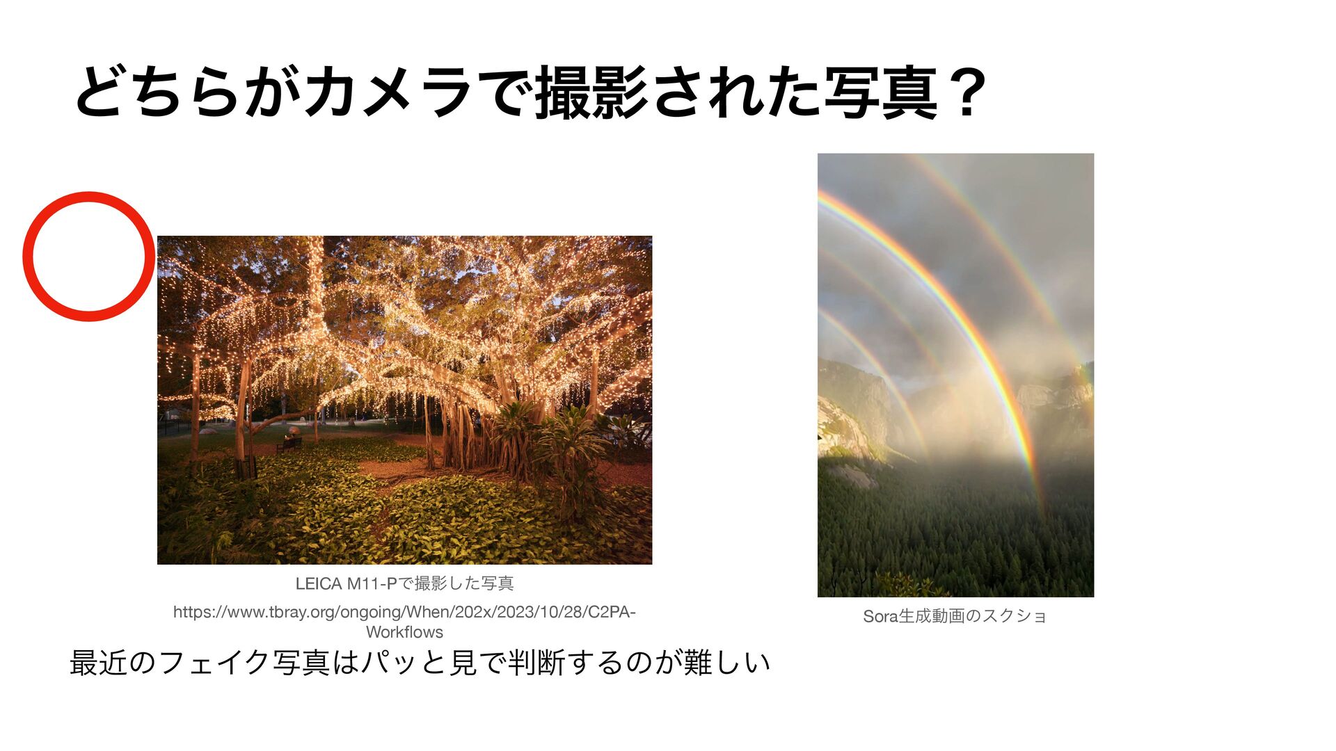 ͲͪΒ͕ΧϝϥͰࡱӨ͞Εͨࣸਅʁ ࠷ۙͷϑΣΠΫࣸਅύοͱݟͰஅ͢Δͷ͕͍͠ LEICA M11-PͰࡱӨͨࣸ͠ਅ https://www.tbray.org/ongoing/When/202x/2023/10/28/C2PA- Work fl ows SoraੜಈըͷεΫγϣ