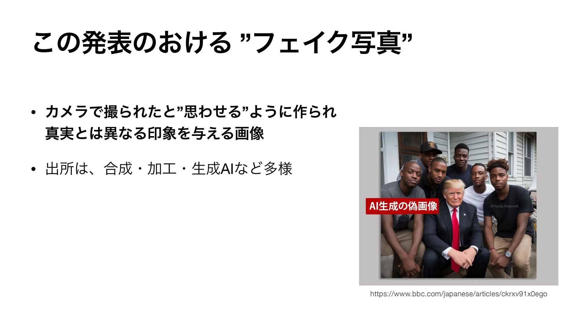 ͜ͷൃදͷ͓͚Δ ”ϑΣΠΫࣸਅ” • ΧϝϥͰࡱΒΕͨͱ”ࢥΘͤΔ”Α͏ʹ࡞ΒΕ ਅ࣮ͱҟͳΔҹΛ༩͑Δը૾ • ग़ॴɺ߹ɾՃɾੜAIͳͲଟ༷ https://www.bbc.com/japanese/articles/ckrxv91x0ego