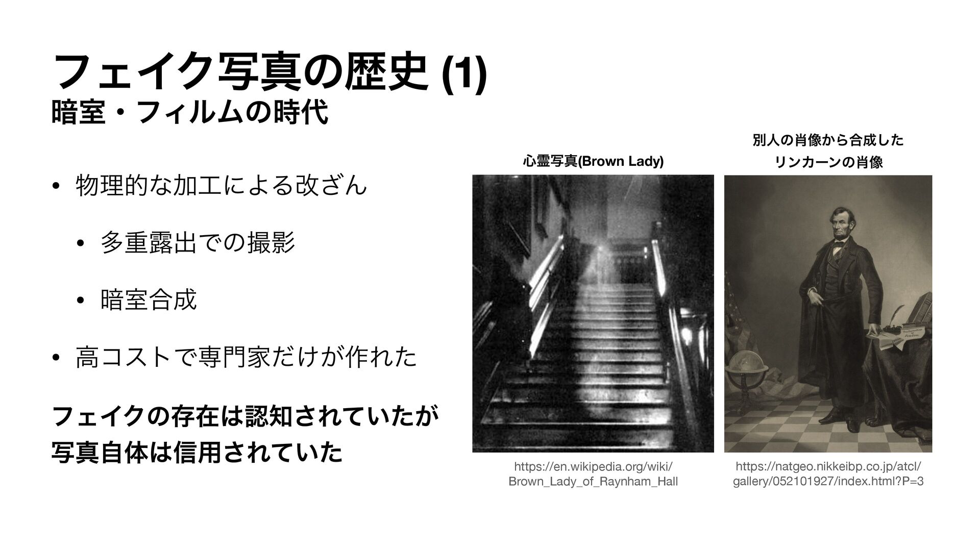 ߴίετͰઐՈ͚͕ͩ࡞Εͨ ϑΣΠΫͷଘࡏೝ͞Ε͍͕ͯͨ ࣸਅࣗମ৴༻͞Ε͍ͯͨ https://en.wikipedia.org/wiki/ Brown_Lady_of_Raynham_Hall ৺ྶࣸਅ(Brown Lady) https://natgeo.nikkeibp.co.jp/atcl/ gallery/052101927/index.html?P=3 ผਓͷ૾͔Β߹ͨ͠ ϦϯΧʔϯͷ૾