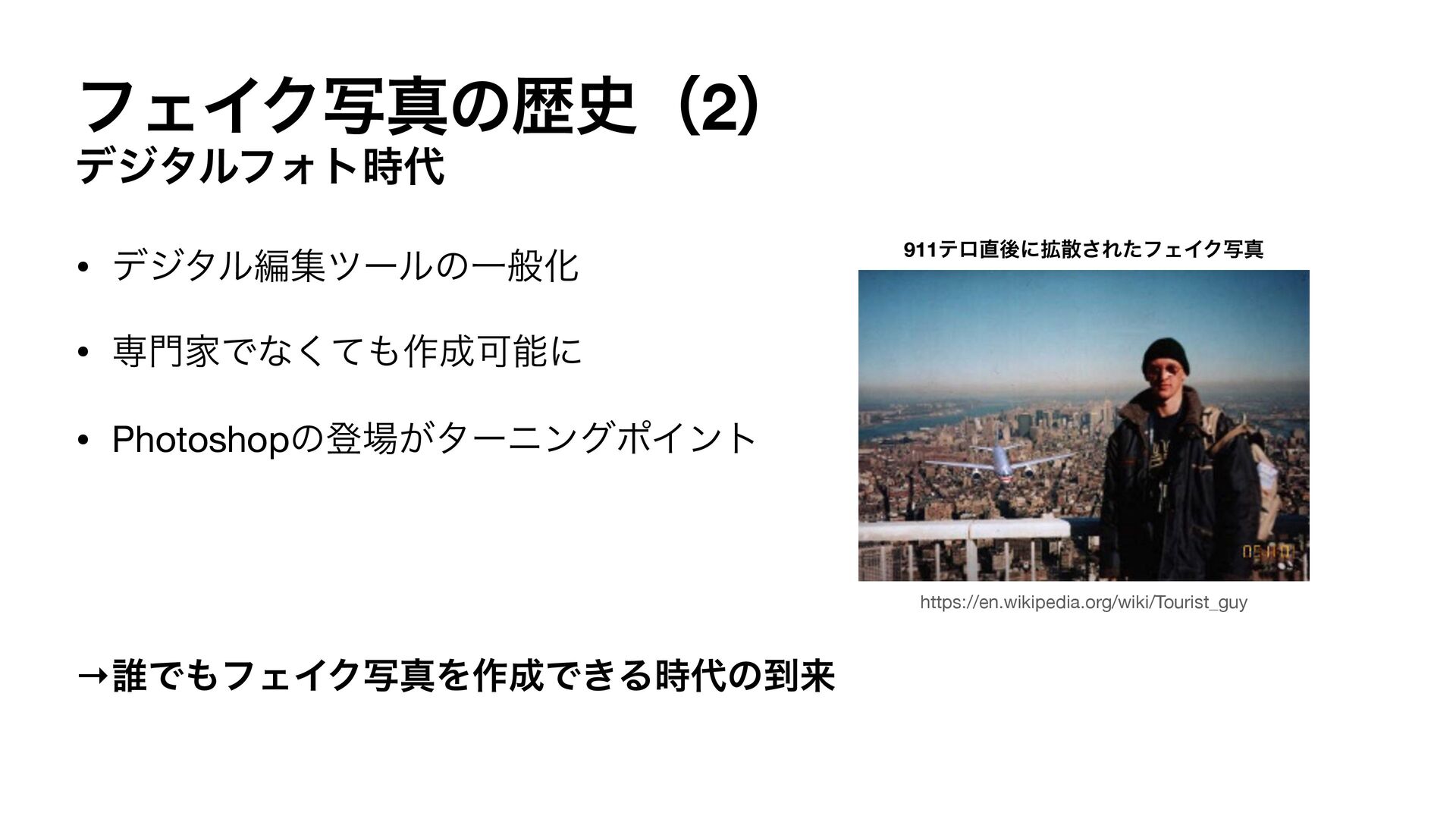 ϑΣΠΫࣸਅͷྺ࢙ʢ2ʣ σδλϧϑΥτ࣌ • σδλϧฤूπʔϧͷҰൠԽ • ઐՈͰͳͯ͘࡞Մೳʹ • Photoshopͷొ͕λʔχϯάϙΠϯτ →୭ͰϑΣΠΫࣸਅΛ࡞Ͱ͖Δ࣌ͷ౸དྷ https://en.wikipedia.org/wiki/Tourist_guy