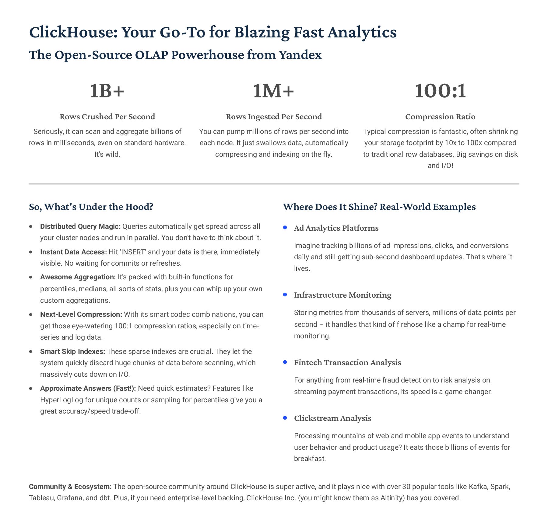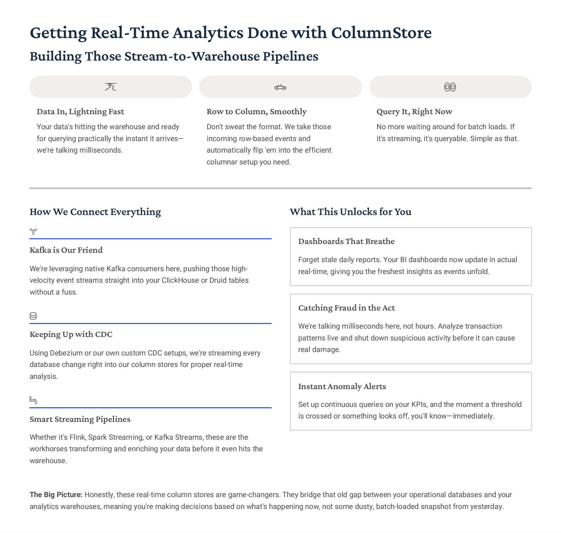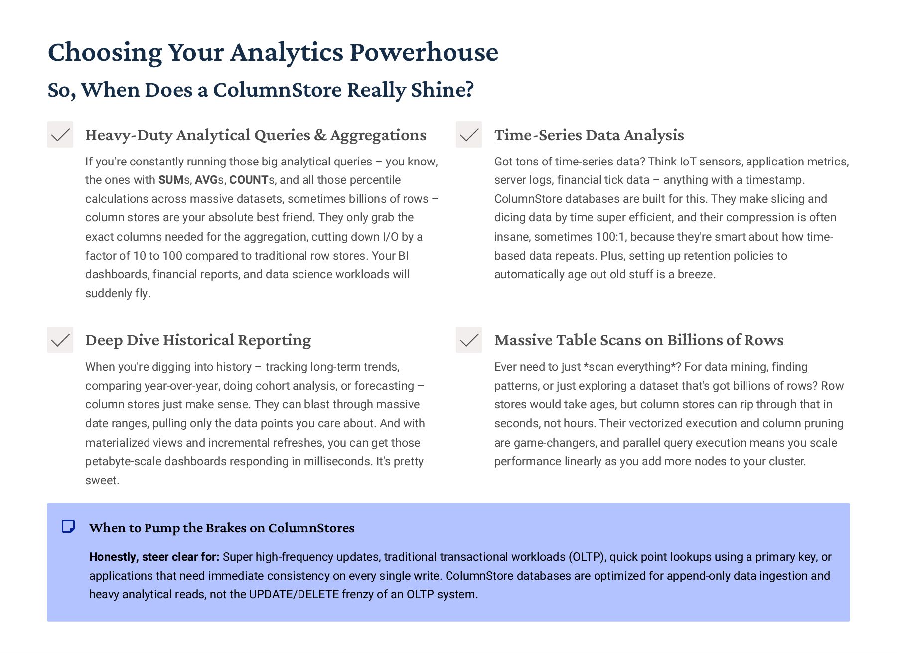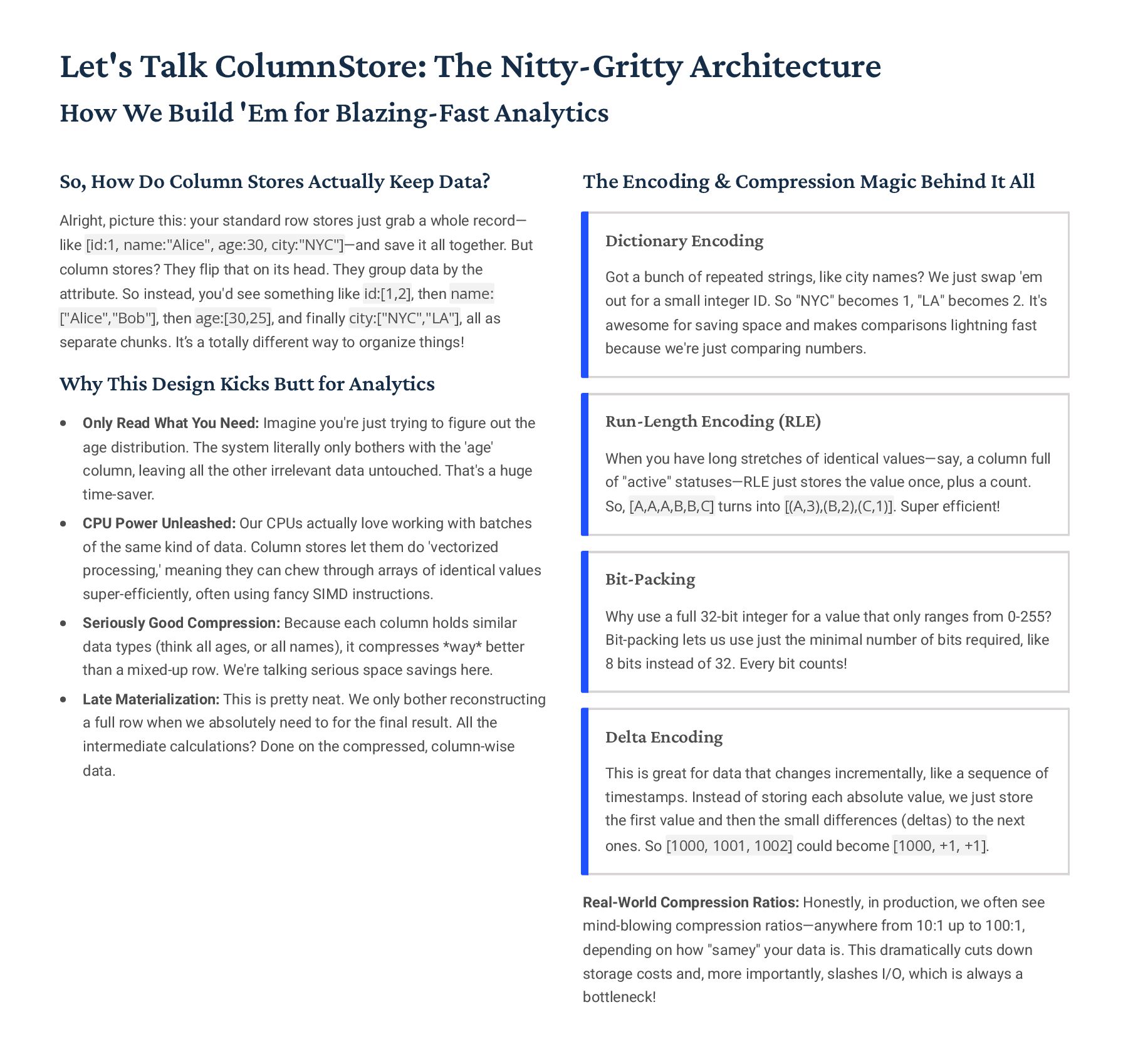 for Blazing-Fast Analytics So, How Do Column Stores Actually Keep Data? Alright, picture this: your standard row stores just grab a whole record4 like [id:1, name:"Alice", age:30, city:"NYC"]4and save it all together. But column stores? They flip that on its head. They group data by the attribute. So instead, you'd see something like id:[1,2], then name: ["Alice","Bob"], then age:[30,25], and finally city:["NYC","LA"], all as separate chunks. It9s a totally different way to organize things! Why This Design Kicks Butt for Analytics Only Read What You Need: Imagine you're just trying to figure out the age distribution. The system literally only bothers with the 'age' column, leaving all the other irrelevant data untouched. That's a huge time-saver. CPU Power Unleashed: Our CPUs actually love working with batches of the same kind of data. Column stores let them do 'vectorized processing,' meaning they can chew through arrays of identical values super-efficiently, often using fancy SIMD instructions. Seriously Good Compression: Because each column holds similar data types (think all ages, or all names), it compresses *way* better than a mixed-up row. We're talking serious space savings here. Late Materialization: This is pretty neat. We only bother reconstructing a full row when we absolutely need to for the final result. All the intermediate calculations? Done on the compressed, column-wise data. The Encoding & Compression Magic Behind It All Dictionary Encoding Got a bunch of repeated strings, like city names? We just swap 'em out for a small integer ID. So "NYC" becomes 1, "LA" becomes 2. It's awesome for saving space and makes comparisons lightning fast because we're just comparing numbers. Run-Length Encoding (RLE) When you have long stretches of identical values4say, a column full of "active" statuses4RLE just stores the value once, plus a count. So, [A,A,A,B,B,C] turns into [(A,3),(B,2),(C,1)]. Super efficient! Bit-Packing Why use a full 32-bit integer for a value that only ranges from 0-255? Bit-packing lets us use just the minimal number of bits required, like 8 bits instead of 32. Every bit counts! Delta Encoding This is great for data that changes incrementally, like a sequence of timestamps. Instead of storing each absolute value, we just store the first value and then the small differences (deltas) to the next ones. So [1000, 1001, 1002] could become [1000, +1, +1]. Real-World Compression Ratios: Honestly, in production, we often see mind-blowing compression ratios4anywhere from 10:1 up to 100:1, depending on how "samey" your data is. This dramatically cuts down storage costs and, more importantly, slashes I/O, which is always a bottleneck!