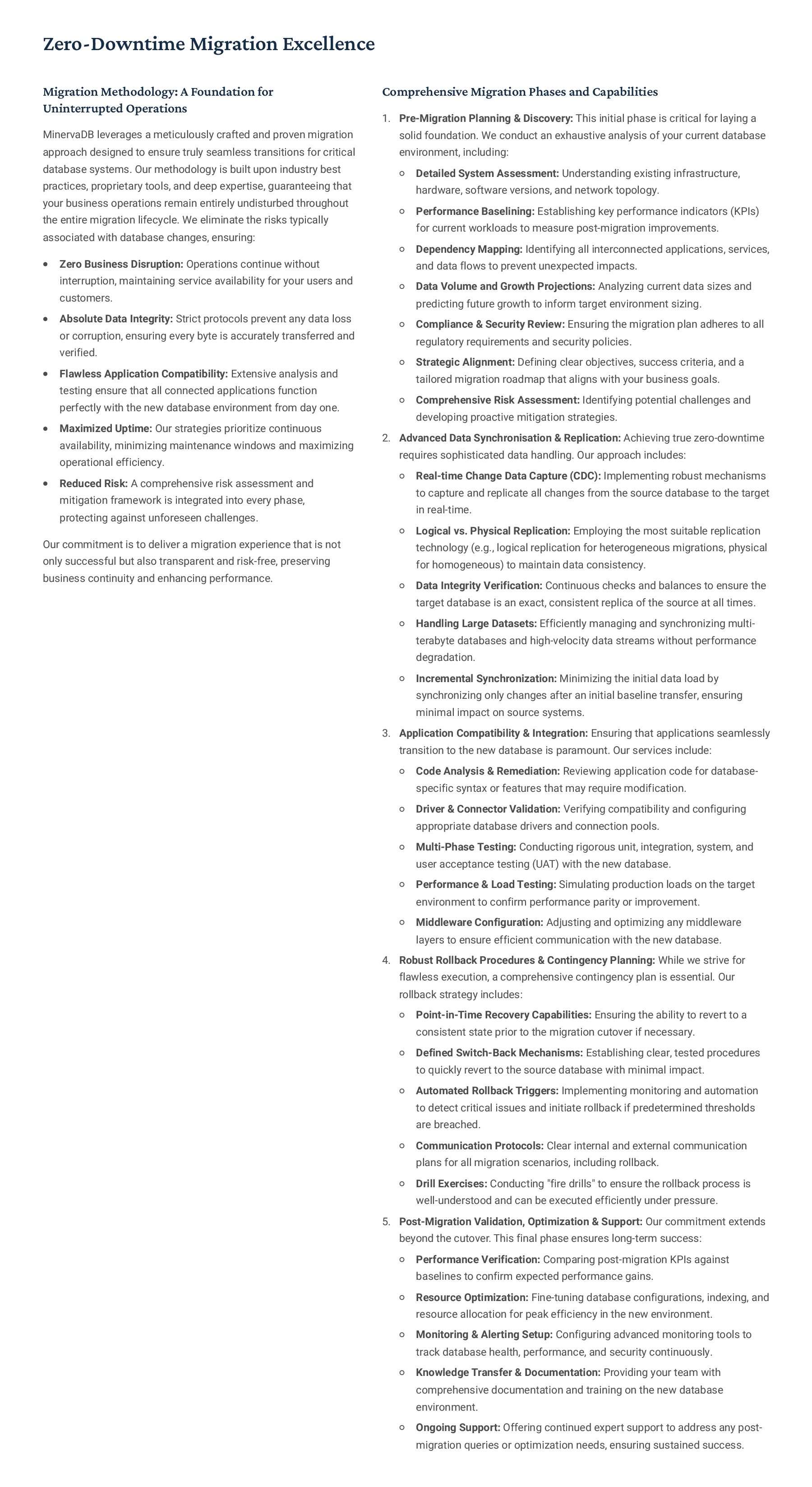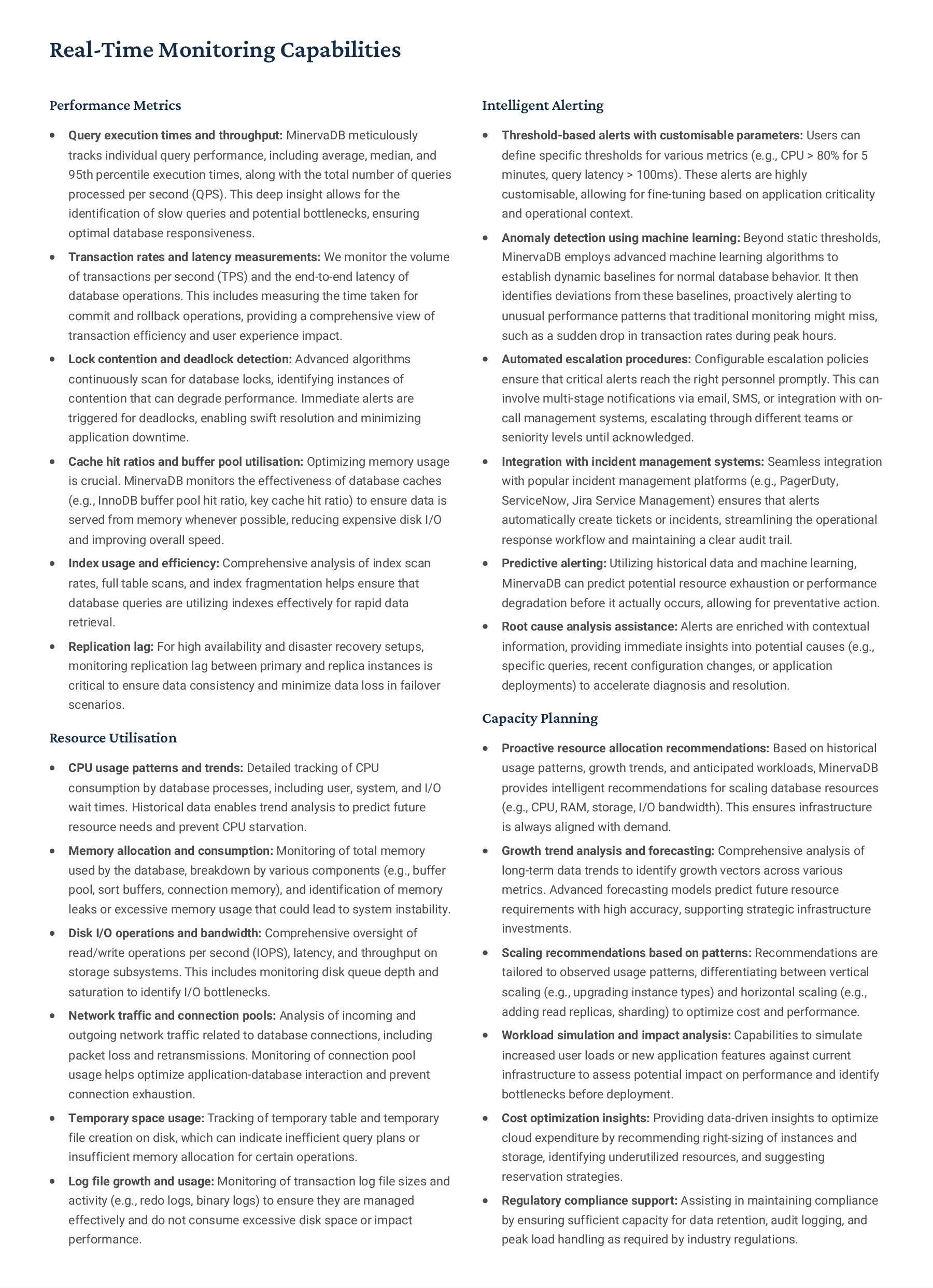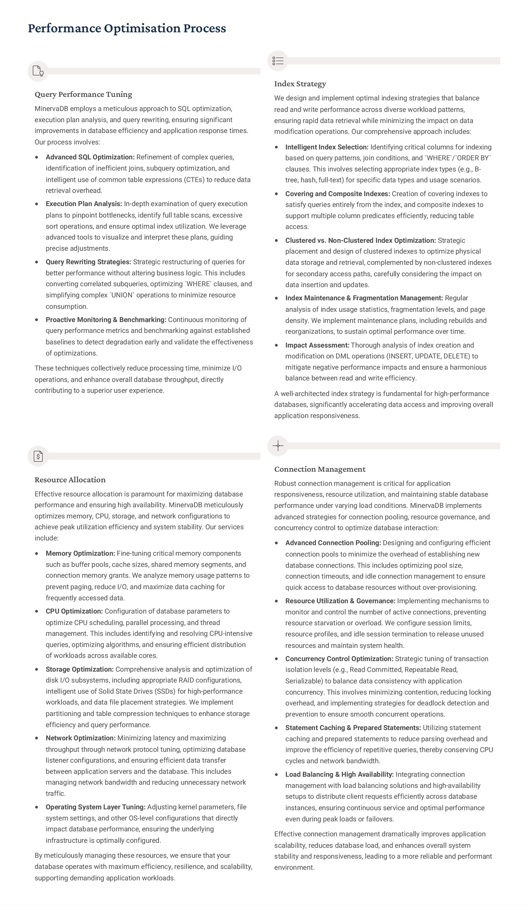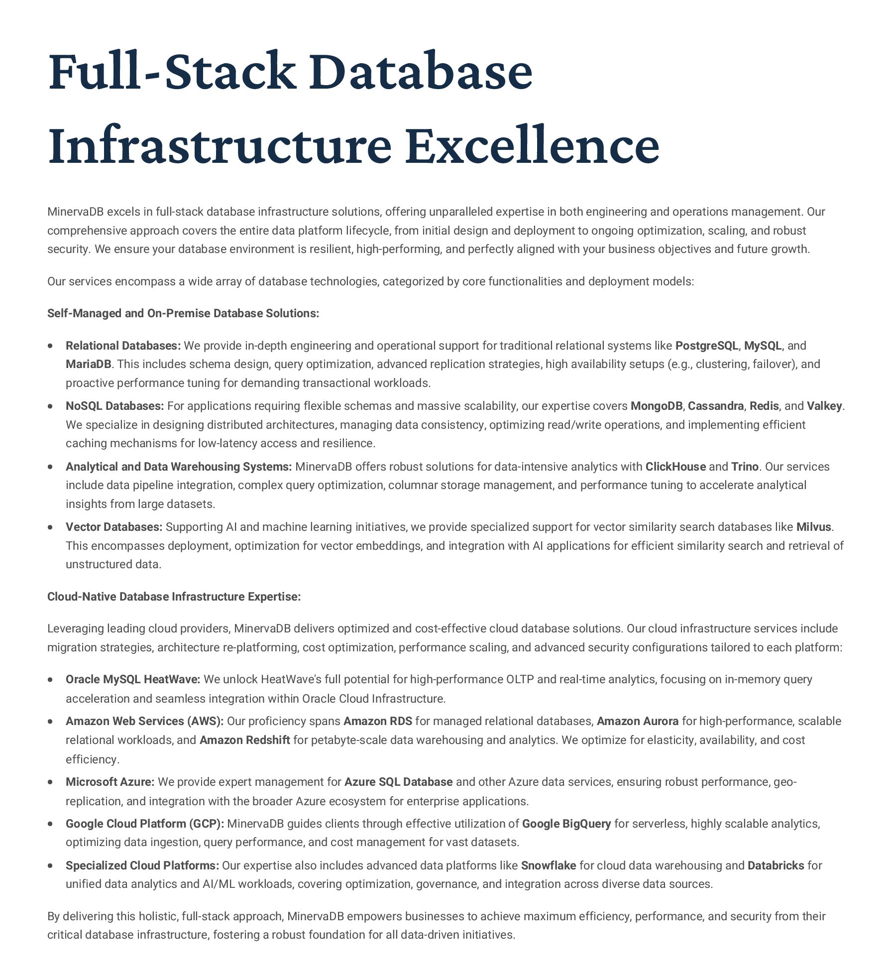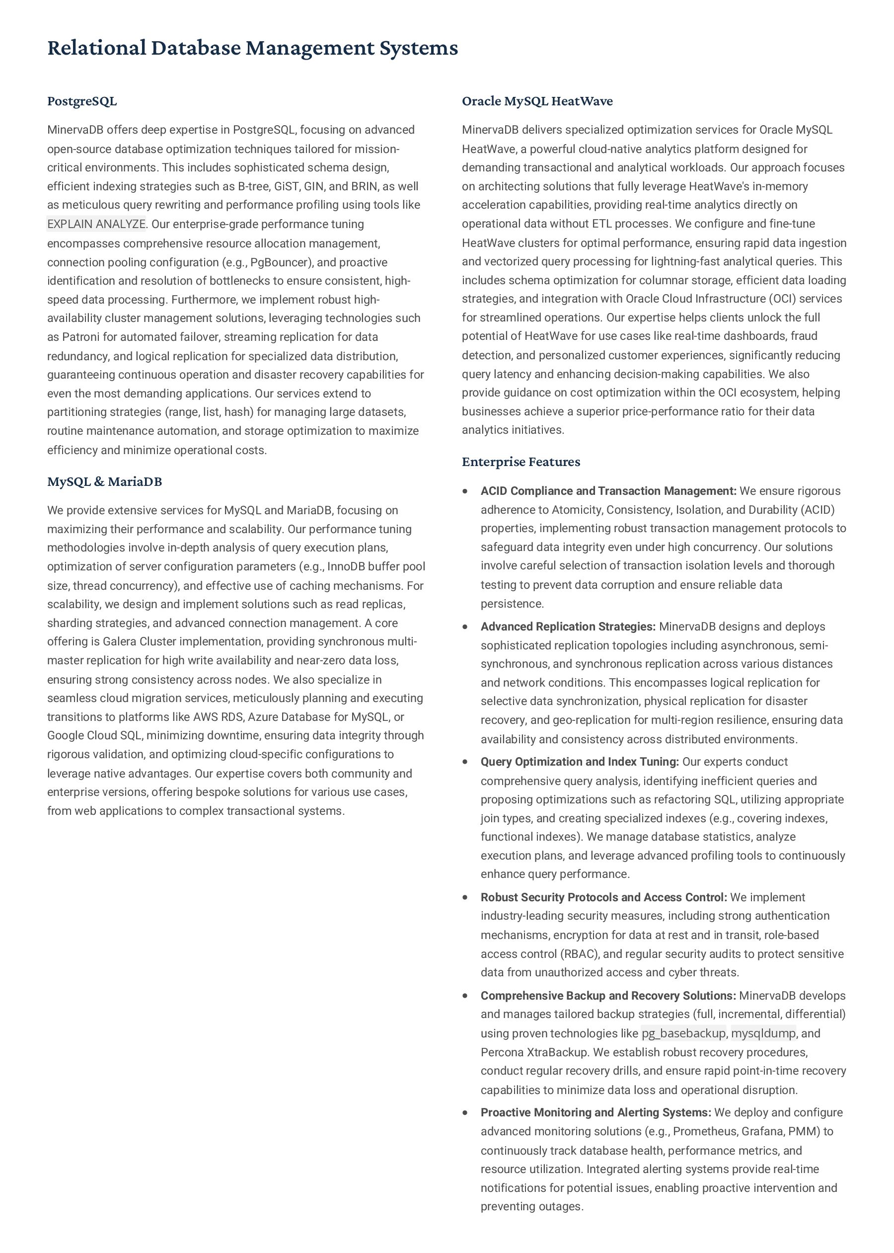 PostgreSQL, focusing on advanced open-source database optimization techniques tailored for mission- critical environments. This includes sophisticated schema design, efficient indexing strategies such as B-tree, GiST, GIN, and BRIN, as well as meticulous query rewriting and performance profiling using tools like EXPLAIN ANALYZE. Our enterprise-grade performance tuning encompasses comprehensive resource allocation management, connection pooling configuration (e.g., PgBouncer), and proactive identification and resolution of bottlenecks to ensure consistent, high- speed data processing. Furthermore, we implement robust high- availability cluster management solutions, leveraging technologies such as Patroni for automated failover, streaming replication for data redundancy, and logical replication for specialized data distribution, guaranteeing continuous operation and disaster recovery capabilities for even the most demanding applications. Our services extend to partitioning strategies (range, list, hash) for managing large datasets, routine maintenance automation, and storage optimization to maximize efficiency and minimize operational costs. MySQL & MariaDB We provide extensive services for MySQL and MariaDB, focusing on maximizing their performance and scalability. Our performance tuning methodologies involve in-depth analysis of query execution plans, optimization of server configuration parameters (e.g., InnoDB buffer pool size, thread concurrency), and effective use of caching mechanisms. For scalability, we design and implement solutions such as read replicas, sharding strategies, and advanced connection management. A core offering is Galera Cluster implementation, providing synchronous multi- master replication for high write availability and near-zero data loss, ensuring strong consistency across nodes. We also specialize in seamless cloud migration services, meticulously planning and executing transitions to platforms like AWS RDS, Azure Database for MySQL, or Google Cloud SQL, minimizing downtime, ensuring data integrity through rigorous validation, and optimizing cloud-specific configurations to leverage native advantages. Our expertise covers both community and enterprise versions, offering bespoke solutions for various use cases, from web applications to complex transactional systems. Oracle MySQL HeatWave MinervaDB delivers specialized optimization services for Oracle MySQL HeatWave, a powerful cloud-native analytics platform designed for demanding transactional and analytical workloads. Our approach focuses on architecting solutions that fully leverage HeatWave's in-memory acceleration capabilities, providing real-time analytics directly on operational data without ETL processes. We configure and fine-tune HeatWave clusters for optimal performance, ensuring rapid data ingestion and vectorized query processing for lightning-fast analytical queries. This includes schema optimization for columnar storage, efficient data loading strategies, and integration with Oracle Cloud Infrastructure (OCI) services for streamlined operations. Our expertise helps clients unlock the full potential of HeatWave for use cases like real-time dashboards, fraud detection, and personalized customer experiences, significantly reducing query latency and enhancing decision-making capabilities. We also provide guidance on cost optimization within the OCI ecosystem, helping businesses achieve a superior price-performance ratio for their data analytics initiatives. Enterprise Features ACID Compliance and Transaction Management: We ensure rigorous adherence to Atomicity, Consistency, Isolation, and Durability (ACID) properties, implementing robust transaction management protocols to safeguard data integrity even under high concurrency. Our solutions involve careful selection of transaction isolation levels and thorough testing to prevent data corruption and ensure reliable data persistence. Advanced Replication Strategies: MinervaDB designs and deploys sophisticated replication topologies including asynchronous, semi- synchronous, and synchronous replication across various distances and network conditions. This encompasses logical replication for selective data synchronization, physical replication for disaster recovery, and geo-replication for multi-region resilience, ensuring data availability and consistency across distributed environments. Query Optimization and Index Tuning: Our experts conduct comprehensive query analysis, identifying inefficient queries and proposing optimizations such as refactoring SQL, utilizing appropriate join types, and creating specialized indexes (e.g., covering indexes, functional indexes). We manage database statistics, analyze execution plans, and leverage advanced profiling tools to continuously enhance query performance. Robust Security Protocols and Access Control: We implement industry-leading security measures, including strong authentication mechanisms, encryption for data at rest and in transit, role-based access control (RBAC), and regular security audits to protect sensitive data from unauthorized access and cyber threats. Comprehensive Backup and Recovery Solutions: MinervaDB develops and manages tailored backup strategies (full, incremental, differential) using proven technologies like pg_basebackup, mysqldump, and Percona XtraBackup. We establish robust recovery procedures, conduct regular recovery drills, and ensure rapid point-in-time recovery capabilities to minimize data loss and operational disruption. Proactive Monitoring and Alerting Systems: We deploy and configure advanced monitoring solutions (e.g., Prometheus, Grafana, PMM) to continuously track database health, performance metrics, and resource utilization. Integrated alerting systems provide real-time notifications for potential issues, enabling proactive intervention and preventing outages.