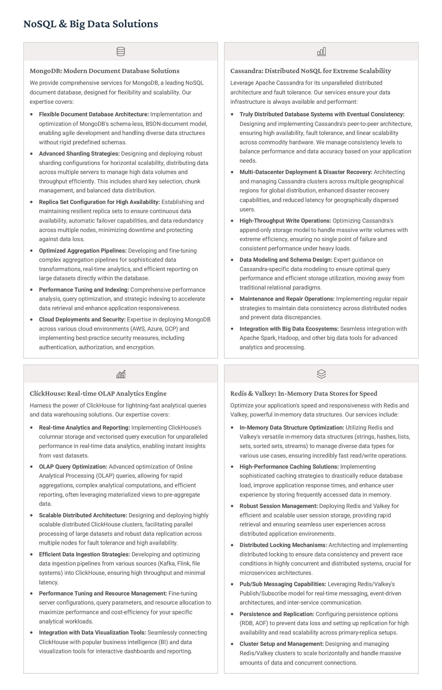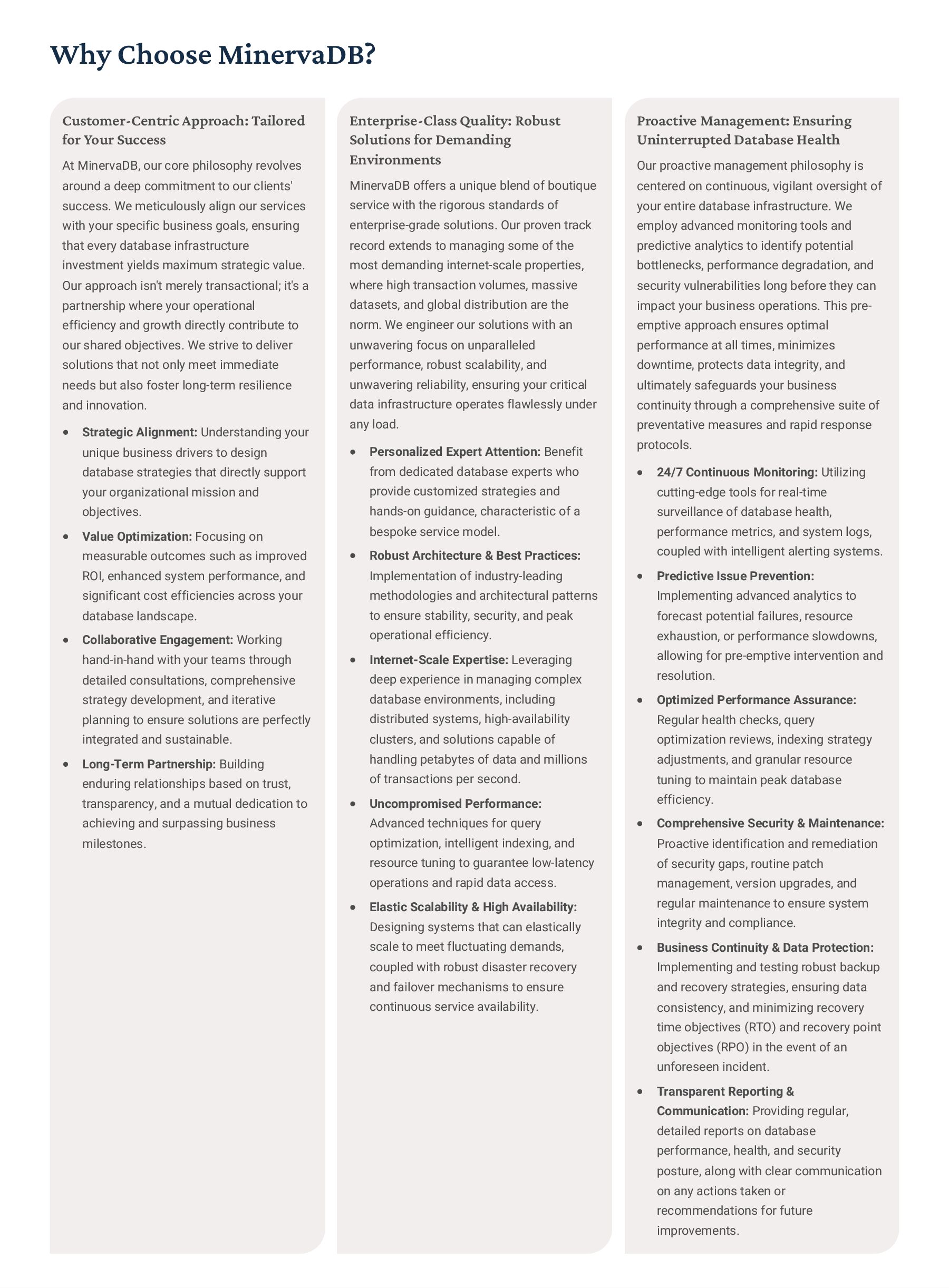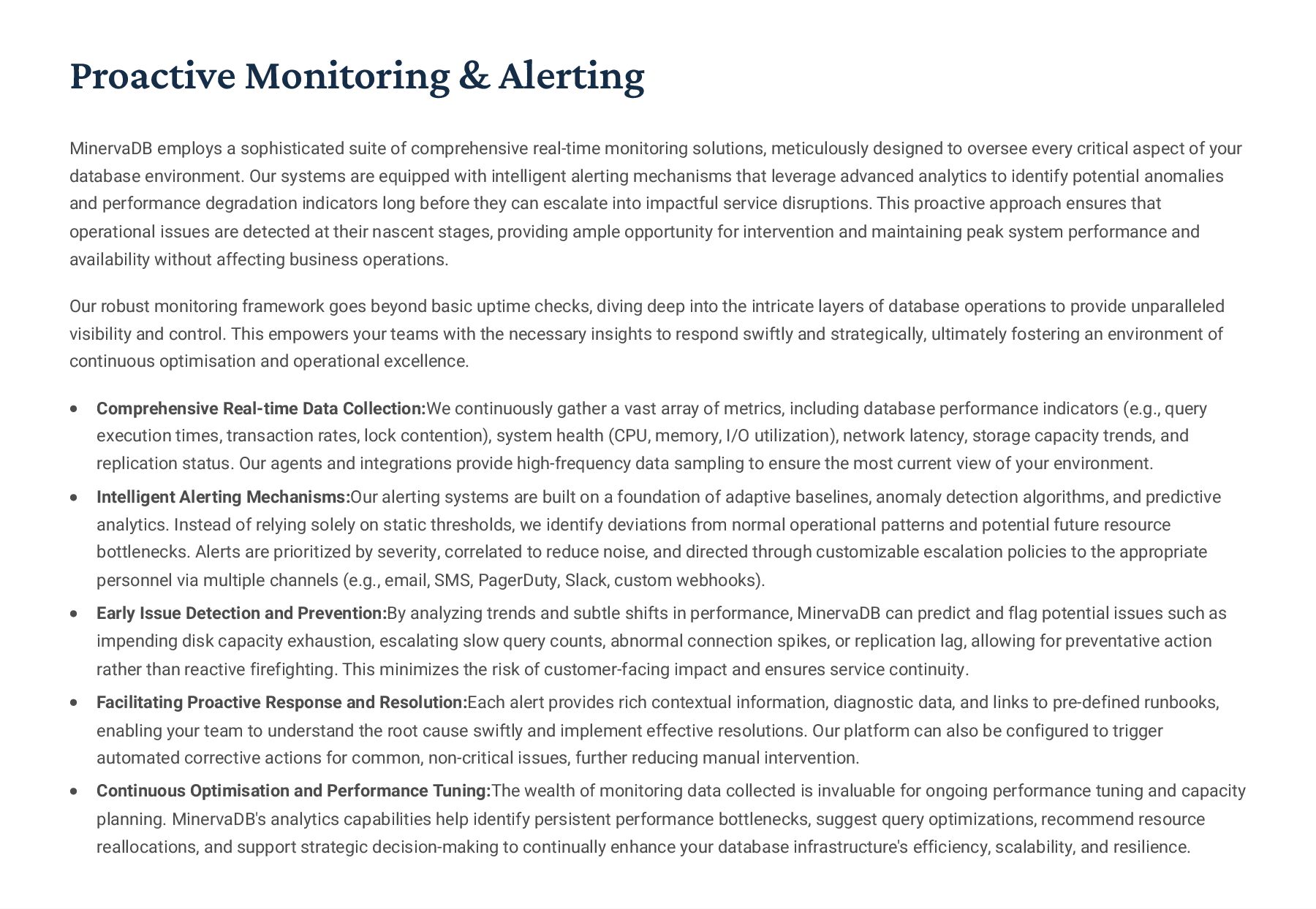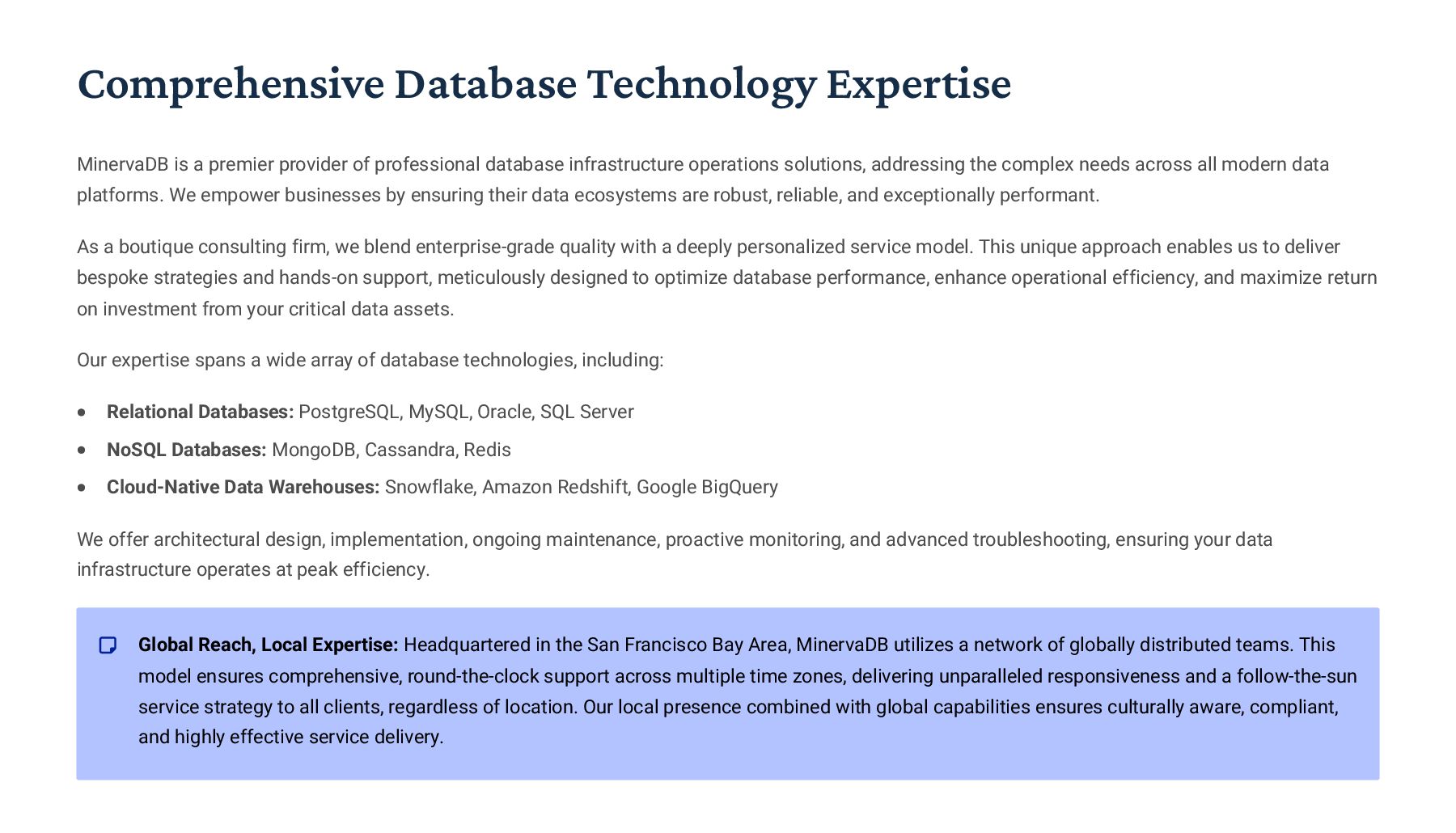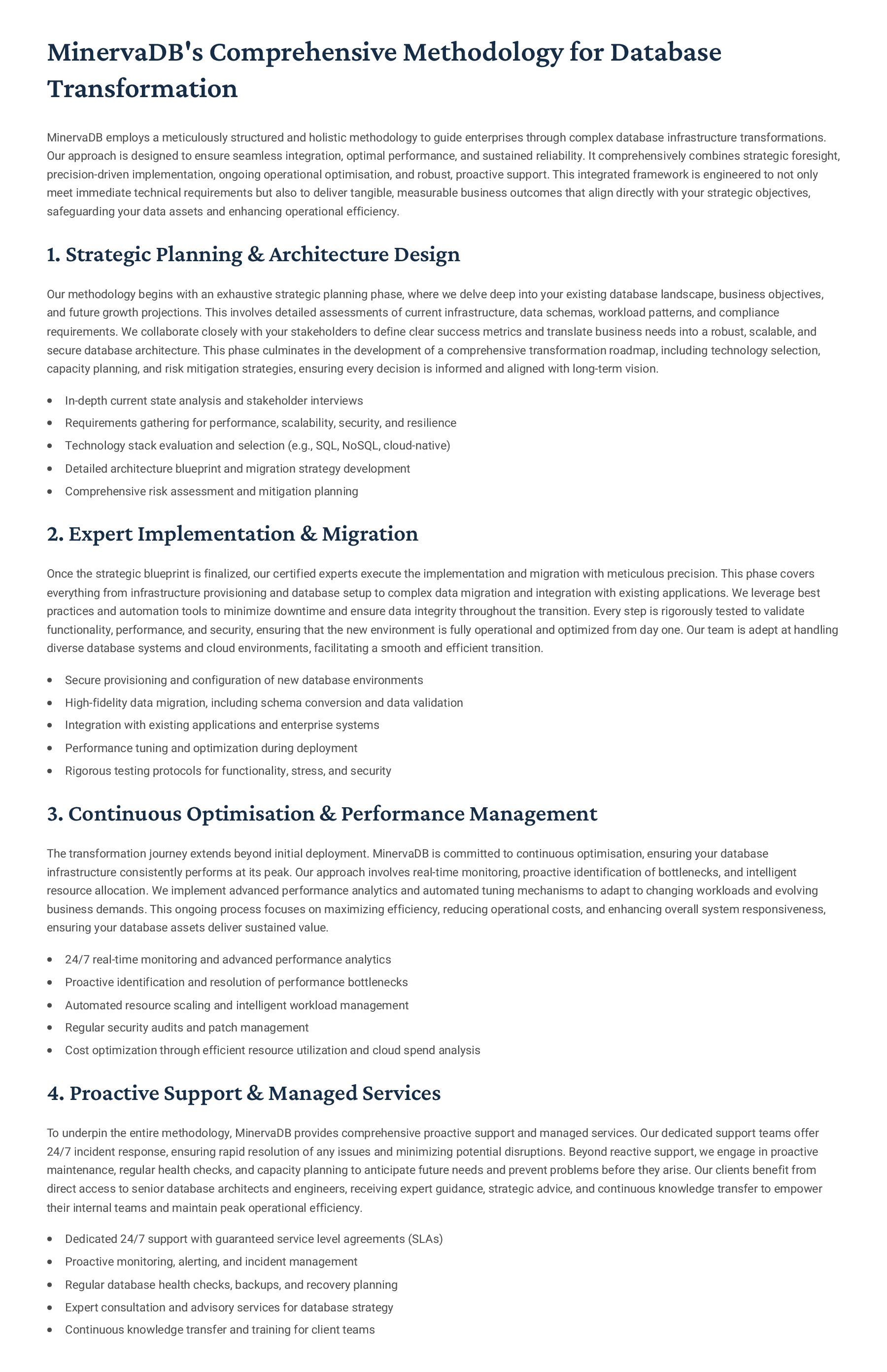PostgreSQL, focusing on advanced open-source database optimization techniques tailored for mission- critical environments. This includes sophisticated schema design, efficient indexing strategies such as B-tree, GiST, GIN, and BRIN, as well as meticulous query rewriting and performance profiling using tools like EXPLAIN ANALYZE. Our enterprise-grade performance tuning encompasses comprehensive resource allocation management, connection pooling configuration (e.g., PgBouncer), and proactive identification and resolution of bottlenecks to ensure consistent, high- speed data processing. Furthermore, we implement robust high- availability cluster management solutions, leveraging technologies such as Patroni for automated failover, streaming replication for data redundancy, and logical replication for specialized data distribution, guaranteeing continuous operation and disaster recovery capabilities for even the most demanding applications. Our services extend to partitioning strategies (range, list, hash) for managing large datasets, routine maintenance automation, and storage optimization to maximize efficiency and minimize operational costs. MySQL & MariaDB We provide extensive services for MySQL and MariaDB, focusing on maximizing their performance and scalability. Our performance tuning methodologies involve in-depth analysis of query execution plans, optimization of server configuration parameters (e.g., InnoDB buffer pool size, thread concurrency), and effective use of caching mechanisms. For scalability, we design and implement solutions such as read replicas, sharding strategies, and advanced connection management. A core offering is Galera Cluster implementation, providing synchronous multi- master replication for high write availability and near-zero data loss, ensuring strong consistency across nodes. We also specialize in seamless cloud migration services, meticulously planning and executing transitions to platforms like AWS RDS, Azure Database for MySQL, or Google Cloud SQL, minimizing downtime, ensuring data integrity through rigorous validation, and optimizing cloud-specific configurations to leverage native advantages. Our expertise covers both community and enterprise versions, offering bespoke solutions for various use cases, from web applications to complex transactional systems. Oracle MySQL HeatWave MinervaDB delivers specialized optimization services for Oracle MySQL HeatWave, a powerful cloud-native analytics platform designed for demanding transactional and analytical workloads. Our approach focuses on architecting solutions that fully leverage HeatWave's in-memory acceleration capabilities, providing real-time analytics directly on operational data without ETL processes. We configure and fine-tune HeatWave clusters for optimal performance, ensuring rapid data ingestion and vectorized query processing for lightning-fast analytical queries. This includes schema optimization for columnar storage, efficient data loading strategies, and integration with Oracle Cloud Infrastructure (OCI) services for streamlined operations. Our expertise helps clients unlock the full potential of HeatWave for use cases like real-time dashboards, fraud detection, and personalized customer experiences, significantly reducing query latency and enhancing decision-making capabilities. We also provide guidance on cost optimization within the OCI ecosystem, helping businesses achieve a superior price-performance ratio for their data analytics initiatives. Enterprise Features ACID Compliance and Transaction Management: We ensure rigorous adherence to Atomicity, Consistency, Isolation, and Durability (ACID) properties, implementing robust transaction management protocols to safeguard data integrity even under high concurrency. Our solutions involve careful selection of transaction isolation levels and thorough testing to prevent data corruption and ensure reliable data persistence. Advanced Replication Strategies: MinervaDB designs and deploys sophisticated replication topologies including asynchronous, semi- synchronous, and synchronous replication across various distances and network conditions. This encompasses logical replication for selective data synchronization, physical replication for disaster recovery, and geo-replication for multi-region resilience, ensuring data availability and consistency across distributed environments. Query Optimization and Index Tuning: Our experts conduct comprehensive query analysis, identifying inefficient queries and proposing optimizations such as refactoring SQL, utilizing appropriate join types, and creating specialized indexes (e.g., covering indexes, functional indexes). We manage database statistics, analyze execution plans, and leverage advanced profiling tools to continuously enhance query performance. Robust Security Protocols and Access Control: We implement industry-leading security measures, including strong authentication mechanisms, encryption for data at rest and in transit, role-based access control (RBAC), and regular security audits to protect sensitive data from unauthorized access and cyber threats. Comprehensive Backup and Recovery Solutions: MinervaDB develops and manages tailored backup strategies (full, incremental, differential) using proven technologies like pg_basebackup, mysqldump, and Percona XtraBackup. We establish robust recovery procedures, conduct regular recovery drills, and ensure rapid point-in-time recovery capabilities to minimize data loss and operational disruption. Proactive Monitoring and Alerting Systems: We deploy and configure advanced monitoring solutions (e.g., Prometheus, Grafana, PMM) to continuously track database health, performance metrics, and resource utilization. Integrated alerting systems provide real-time notifications for potential issues, enabling proactive intervention and preventing outages.