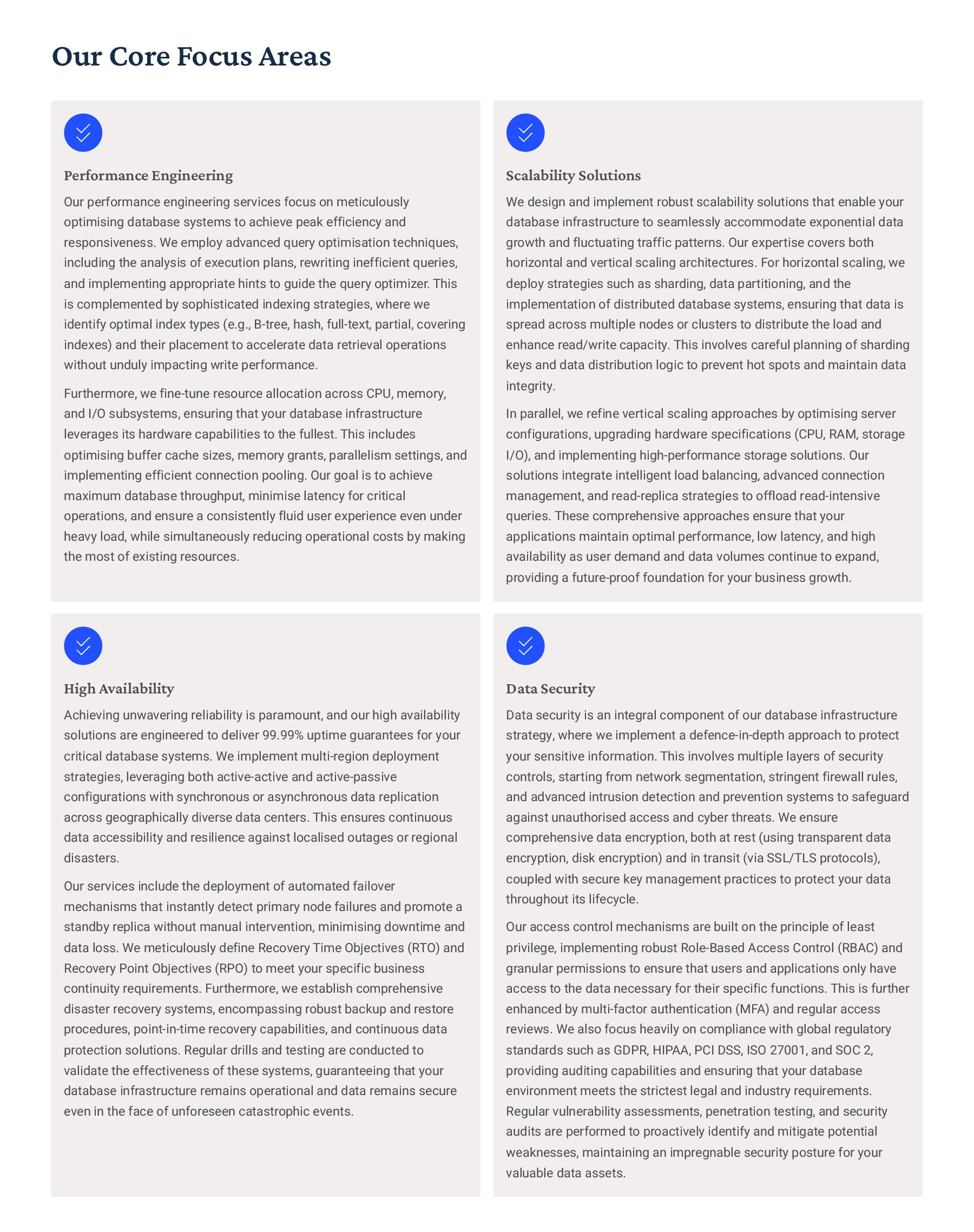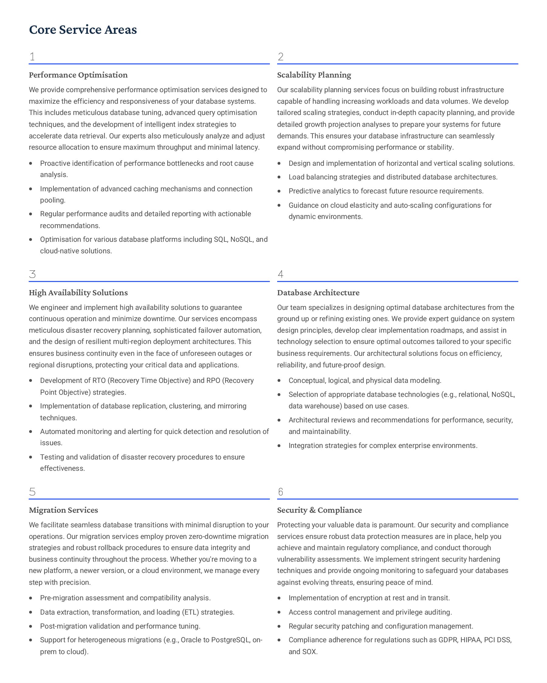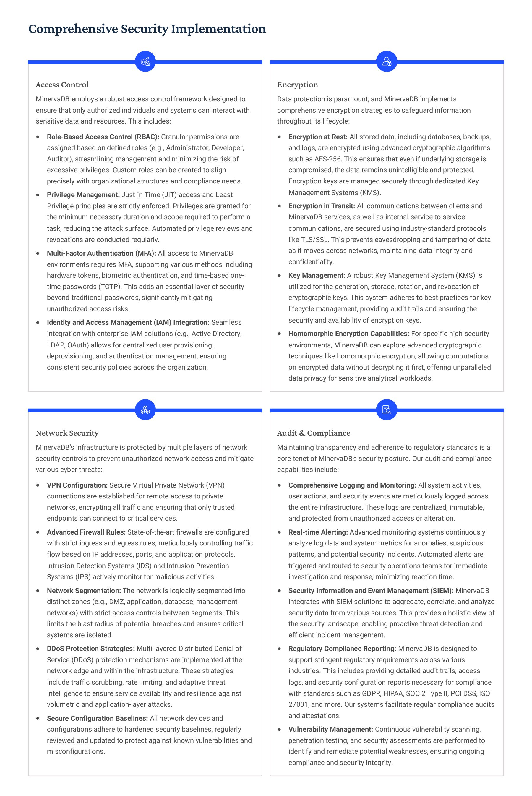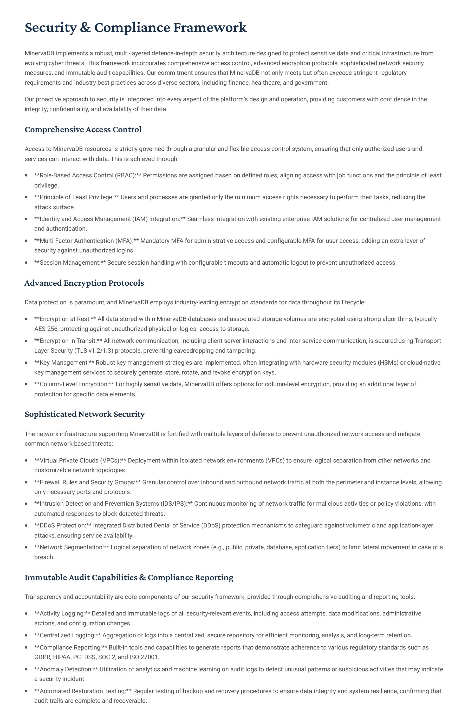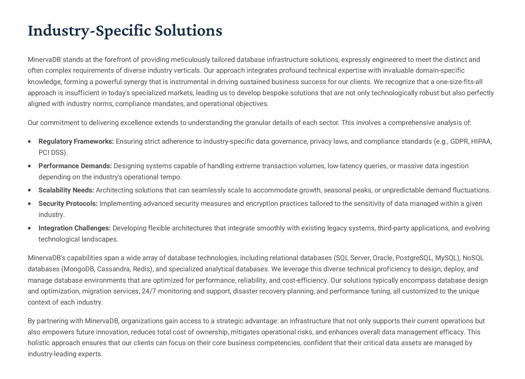 PostgreSQL, focusing on advanced open-source database optimization techniques tailored for mission- critical environments. This includes sophisticated schema design, efficient indexing strategies such as B-tree, GiST, GIN, and BRIN, as well as meticulous query rewriting and performance profiling using tools like EXPLAIN ANALYZE. Our enterprise-grade performance tuning encompasses comprehensive resource allocation management, connection pooling configuration (e.g., PgBouncer), and proactive identification and resolution of bottlenecks to ensure consistent, high- speed data processing. Furthermore, we implement robust high- availability cluster management solutions, leveraging technologies such as Patroni for automated failover, streaming replication for data redundancy, and logical replication for specialized data distribution, guaranteeing continuous operation and disaster recovery capabilities for even the most demanding applications. Our services extend to partitioning strategies (range, list, hash) for managing large datasets, routine maintenance automation, and storage optimization to maximize efficiency and minimize operational costs. MySQL & MariaDB We provide extensive services for MySQL and MariaDB, focusing on maximizing their performance and scalability. Our performance tuning methodologies involve in-depth analysis of query execution plans, optimization of server configuration parameters (e.g., InnoDB buffer pool size, thread concurrency), and effective use of caching mechanisms. For scalability, we design and implement solutions such as read replicas, sharding strategies, and advanced connection management. A core offering is Galera Cluster implementation, providing synchronous multi- master replication for high write availability and near-zero data loss, ensuring strong consistency across nodes. We also specialize in seamless cloud migration services, meticulously planning and executing transitions to platforms like AWS RDS, Azure Database for MySQL, or Google Cloud SQL, minimizing downtime, ensuring data integrity through rigorous validation, and optimizing cloud-specific configurations to leverage native advantages. Our expertise covers both community and enterprise versions, offering bespoke solutions for various use cases, from web applications to complex transactional systems. Oracle MySQL HeatWave MinervaDB delivers specialized optimization services for Oracle MySQL HeatWave, a powerful cloud-native analytics platform designed for demanding transactional and analytical workloads. Our approach focuses on architecting solutions that fully leverage HeatWave's in-memory acceleration capabilities, providing real-time analytics directly on operational data without ETL processes. We configure and fine-tune HeatWave clusters for optimal performance, ensuring rapid data ingestion and vectorized query processing for lightning-fast analytical queries. This includes schema optimization for columnar storage, efficient data loading strategies, and integration with Oracle Cloud Infrastructure (OCI) services for streamlined operations. Our expertise helps clients unlock the full potential of HeatWave for use cases like real-time dashboards, fraud detection, and personalized customer experiences, significantly reducing query latency and enhancing decision-making capabilities. We also provide guidance on cost optimization within the OCI ecosystem, helping businesses achieve a superior price-performance ratio for their data analytics initiatives. Enterprise Features ACID Compliance and Transaction Management: We ensure rigorous adherence to Atomicity, Consistency, Isolation, and Durability (ACID) properties, implementing robust transaction management protocols to safeguard data integrity even under high concurrency. Our solutions involve careful selection of transaction isolation levels and thorough testing to prevent data corruption and ensure reliable data persistence. Advanced Replication Strategies: MinervaDB designs and deploys sophisticated replication topologies including asynchronous, semi- synchronous, and synchronous replication across various distances and network conditions. This encompasses logical replication for selective data synchronization, physical replication for disaster recovery, and geo-replication for multi-region resilience, ensuring data availability and consistency across distributed environments. Query Optimization and Index Tuning: Our experts conduct comprehensive query analysis, identifying inefficient queries and proposing optimizations such as refactoring SQL, utilizing appropriate join types, and creating specialized indexes (e.g., covering indexes, functional indexes). We manage database statistics, analyze execution plans, and leverage advanced profiling tools to continuously enhance query performance. Robust Security Protocols and Access Control: We implement industry-leading security measures, including strong authentication mechanisms, encryption for data at rest and in transit, role-based access control (RBAC), and regular security audits to protect sensitive data from unauthorized access and cyber threats. Comprehensive Backup and Recovery Solutions: MinervaDB develops and manages tailored backup strategies (full, incremental, differential) using proven technologies like pg_basebackup, mysqldump, and Percona XtraBackup. We establish robust recovery procedures, conduct regular recovery drills, and ensure rapid point-in-time recovery capabilities to minimize data loss and operational disruption. Proactive Monitoring and Alerting Systems: We deploy and configure advanced monitoring solutions (e.g., Prometheus, Grafana, PMM) to continuously track database health, performance metrics, and resource utilization. Integrated alerting systems provide real-time notifications for potential issues, enabling proactive intervention and preventing outages.