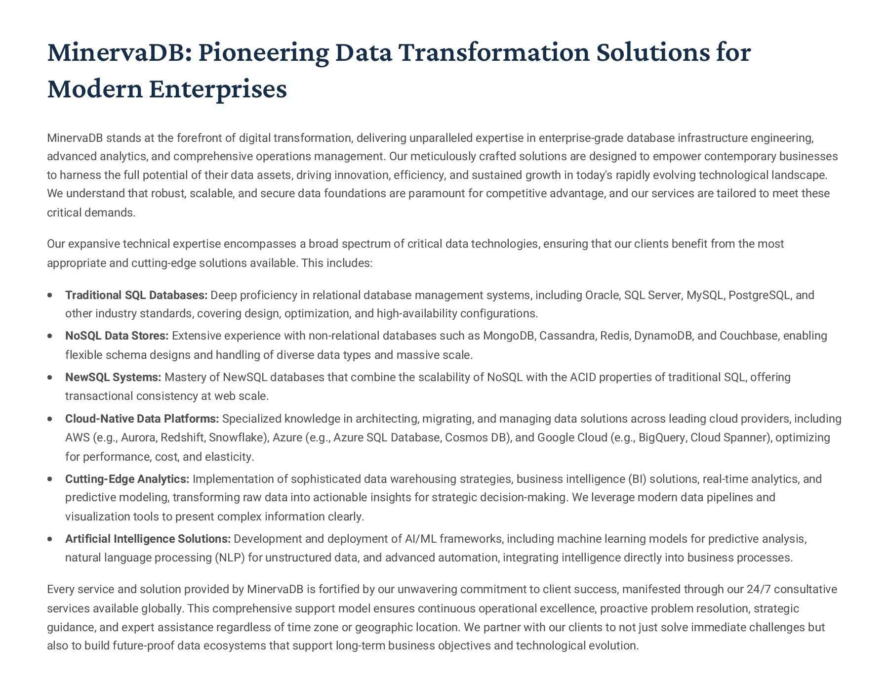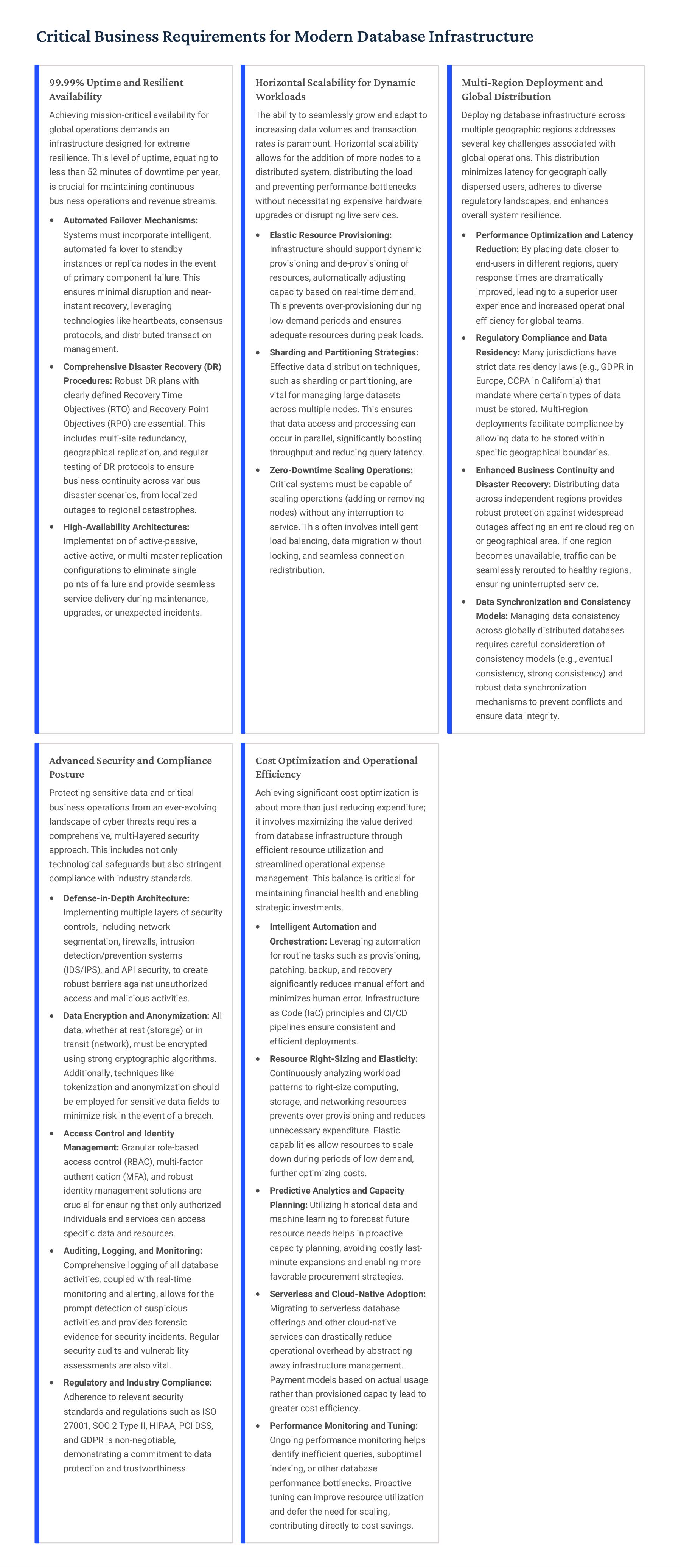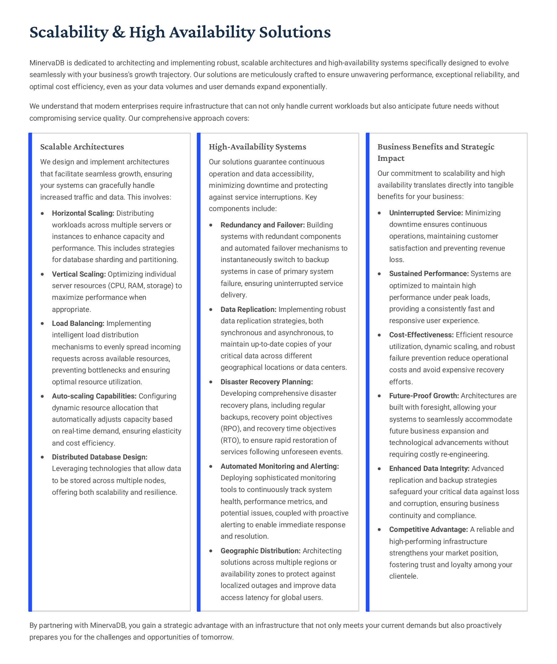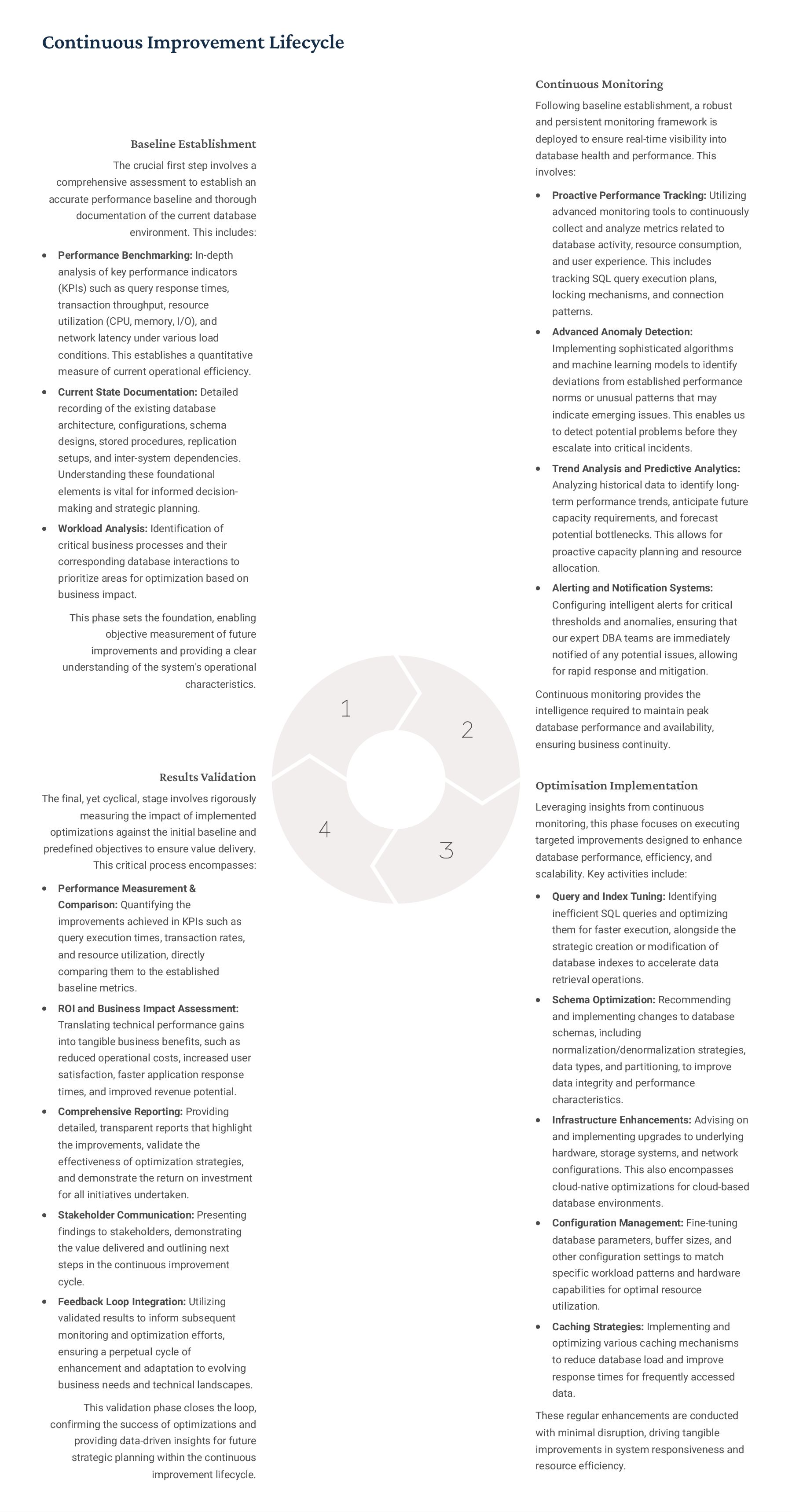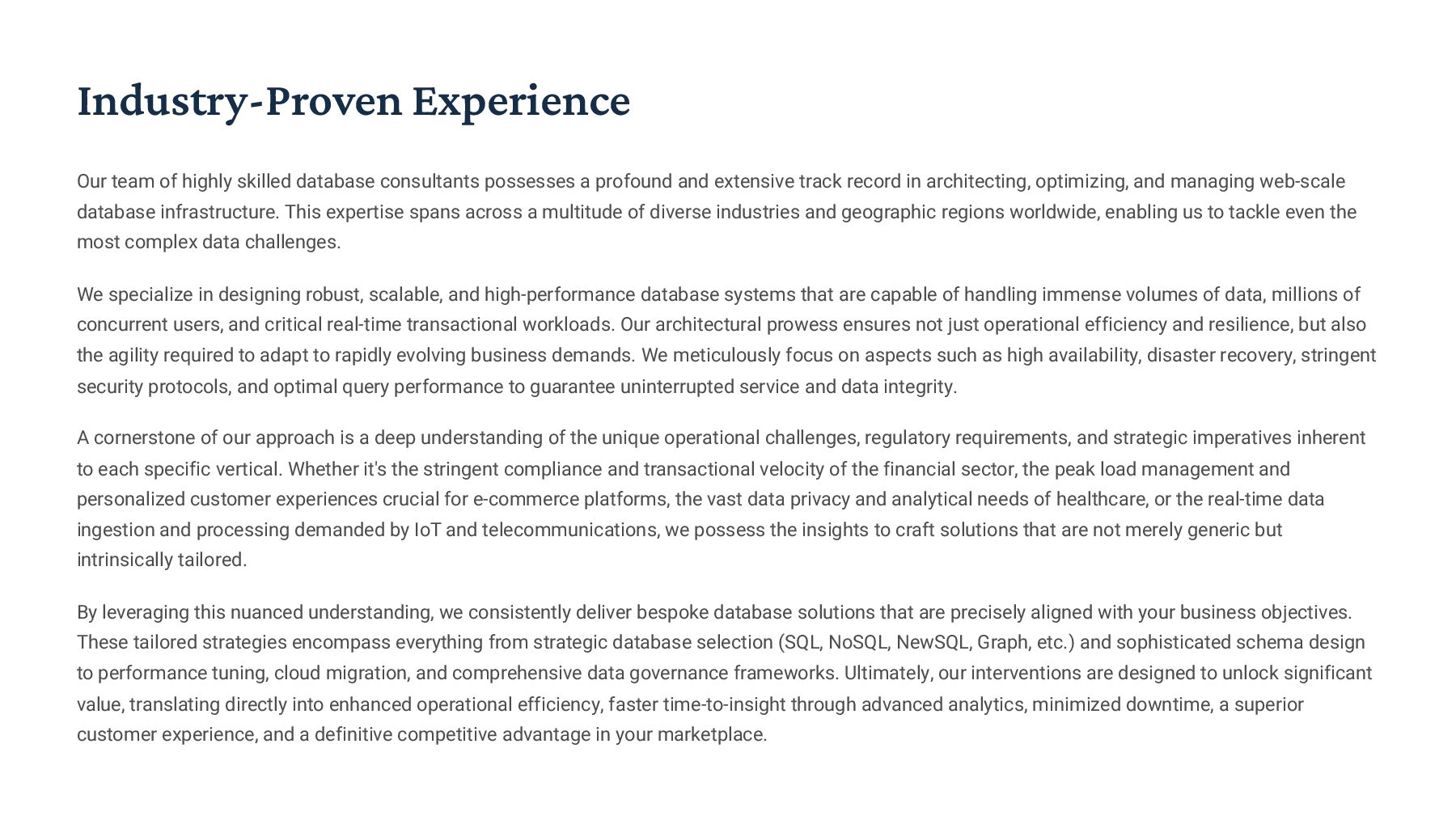 PostgreSQL, focusing on advanced open-source database optimization techniques tailored for mission- critical environments. This includes sophisticated schema design, efficient indexing strategies such as B-tree, GiST, GIN, and BRIN, as well as meticulous query rewriting and performance profiling using tools like EXPLAIN ANALYZE. Our enterprise-grade performance tuning encompasses comprehensive resource allocation management, connection pooling configuration (e.g., PgBouncer), and proactive identification and resolution of bottlenecks to ensure consistent, high- speed data processing. Furthermore, we implement robust high- availability cluster management solutions, leveraging technologies such as Patroni for automated failover, streaming replication for data redundancy, and logical replication for specialized data distribution, guaranteeing continuous operation and disaster recovery capabilities for even the most demanding applications. Our services extend to partitioning strategies (range, list, hash) for managing large datasets, routine maintenance automation, and storage optimization to maximize efficiency and minimize operational costs. MySQL & MariaDB We provide extensive services for MySQL and MariaDB, focusing on maximizing their performance and scalability. Our performance tuning methodologies involve in-depth analysis of query execution plans, optimization of server configuration parameters (e.g., InnoDB buffer pool size, thread concurrency), and effective use of caching mechanisms. For scalability, we design and implement solutions such as read replicas, sharding strategies, and advanced connection management. A core offering is Galera Cluster implementation, providing synchronous multi- master replication for high write availability and near-zero data loss, ensuring strong consistency across nodes. We also specialize in seamless cloud migration services, meticulously planning and executing transitions to platforms like AWS RDS, Azure Database for MySQL, or Google Cloud SQL, minimizing downtime, ensuring data integrity through rigorous validation, and optimizing cloud-specific configurations to leverage native advantages. Our expertise covers both community and enterprise versions, offering bespoke solutions for various use cases, from web applications to complex transactional systems. Oracle MySQL HeatWave MinervaDB delivers specialized optimization services for Oracle MySQL HeatWave, a powerful cloud-native analytics platform designed for demanding transactional and analytical workloads. Our approach focuses on architecting solutions that fully leverage HeatWave's in-memory acceleration capabilities, providing real-time analytics directly on operational data without ETL processes. We configure and fine-tune HeatWave clusters for optimal performance, ensuring rapid data ingestion and vectorized query processing for lightning-fast analytical queries. This includes schema optimization for columnar storage, efficient data loading strategies, and integration with Oracle Cloud Infrastructure (OCI) services for streamlined operations. Our expertise helps clients unlock the full potential of HeatWave for use cases like real-time dashboards, fraud detection, and personalized customer experiences, significantly reducing query latency and enhancing decision-making capabilities. We also provide guidance on cost optimization within the OCI ecosystem, helping businesses achieve a superior price-performance ratio for their data analytics initiatives. Enterprise Features ACID Compliance and Transaction Management: We ensure rigorous adherence to Atomicity, Consistency, Isolation, and Durability (ACID) properties, implementing robust transaction management protocols to safeguard data integrity even under high concurrency. Our solutions involve careful selection of transaction isolation levels and thorough testing to prevent data corruption and ensure reliable data persistence. Advanced Replication Strategies: MinervaDB designs and deploys sophisticated replication topologies including asynchronous, semi- synchronous, and synchronous replication across various distances and network conditions. This encompasses logical replication for selective data synchronization, physical replication for disaster recovery, and geo-replication for multi-region resilience, ensuring data availability and consistency across distributed environments. Query Optimization and Index Tuning: Our experts conduct comprehensive query analysis, identifying inefficient queries and proposing optimizations such as refactoring SQL, utilizing appropriate join types, and creating specialized indexes (e.g., covering indexes, functional indexes). We manage database statistics, analyze execution plans, and leverage advanced profiling tools to continuously enhance query performance. Robust Security Protocols and Access Control: We implement industry-leading security measures, including strong authentication mechanisms, encryption for data at rest and in transit, role-based access control (RBAC), and regular security audits to protect sensitive data from unauthorized access and cyber threats. Comprehensive Backup and Recovery Solutions: MinervaDB develops and manages tailored backup strategies (full, incremental, differential) using proven technologies like pg_basebackup, mysqldump, and Percona XtraBackup. We establish robust recovery procedures, conduct regular recovery drills, and ensure rapid point-in-time recovery capabilities to minimize data loss and operational disruption. Proactive Monitoring and Alerting Systems: We deploy and configure advanced monitoring solutions (e.g., Prometheus, Grafana, PMM) to continuously track database health, performance metrics, and resource utilization. Integrated alerting systems provide real-time notifications for potential issues, enabling proactive intervention and preventing outages.
